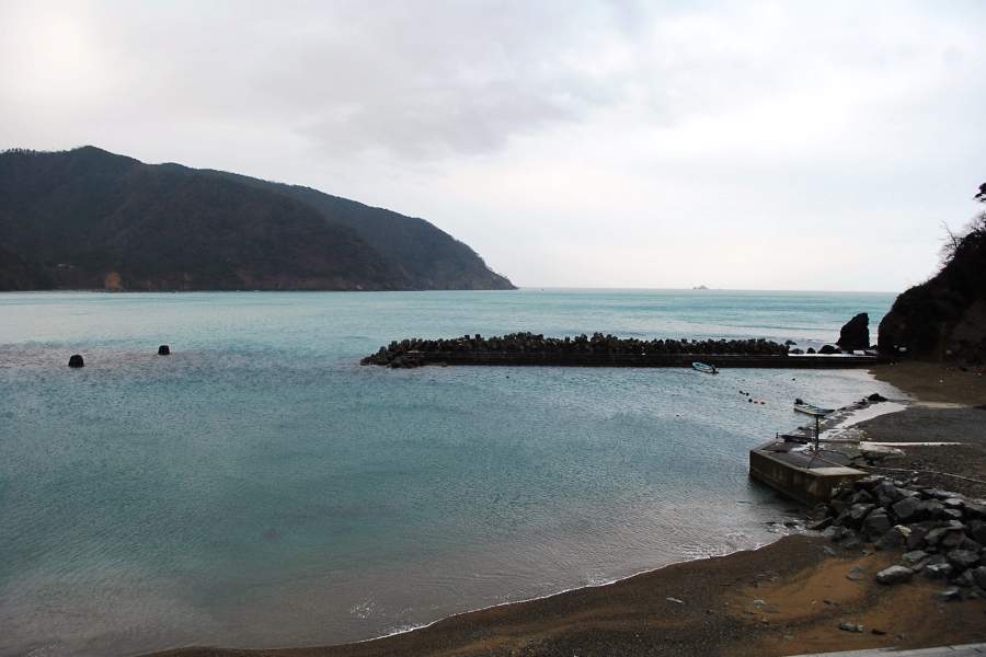 食見海岸はほとんど波はなく、時折風で水面に模様が走ります。