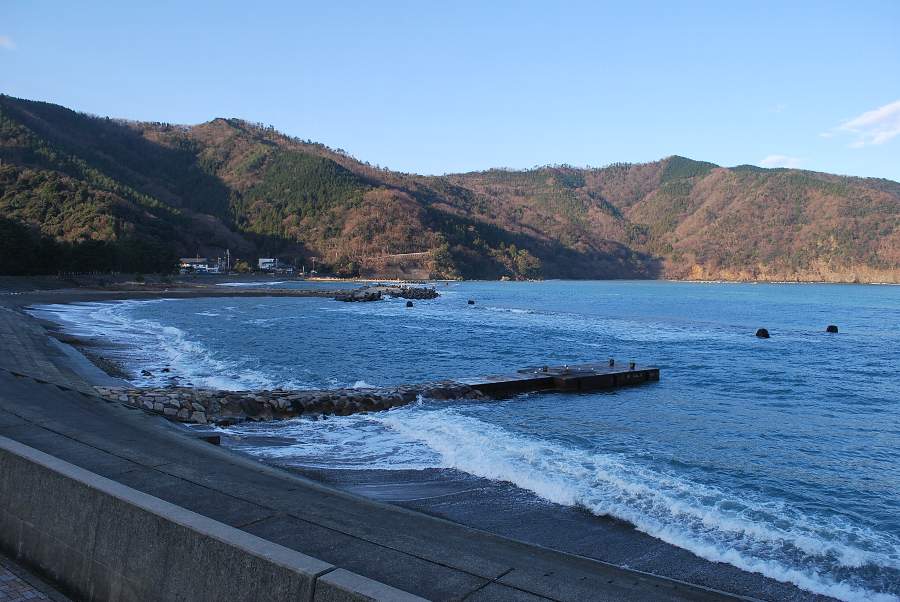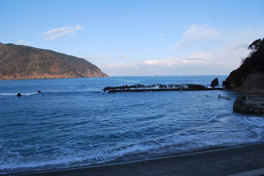 食見海岸は約2mの波があり、防波堤に波が被ります。