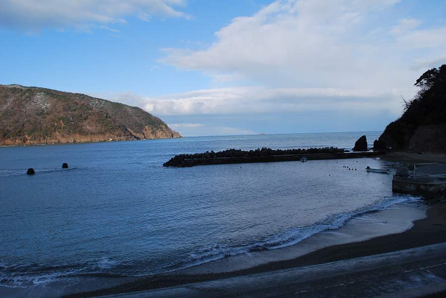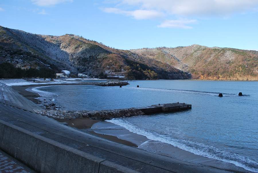 食見海岸は昨夜の降雪で白んでおりますが、交通に支障が出るほどの積雪はありません。また、約1mの波があり、時々防波堤の根元に波が被ります。