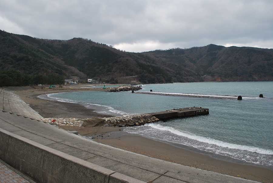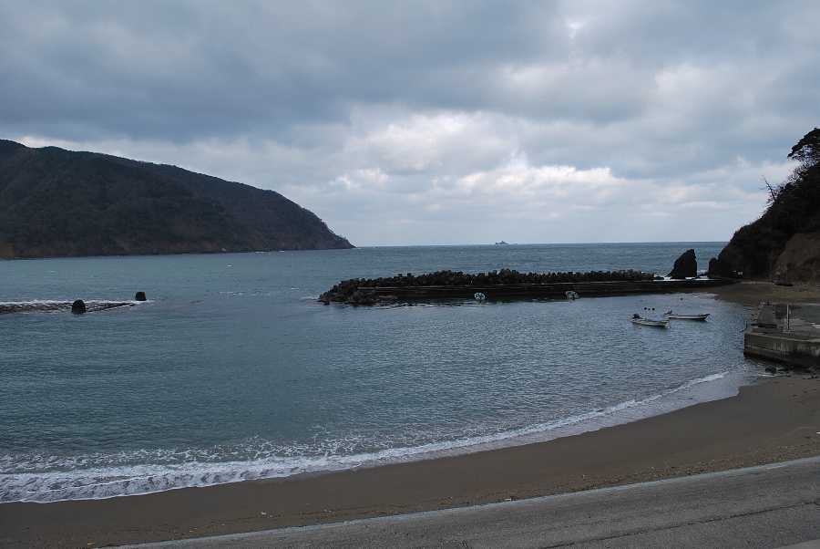 食見海岸は約1mの波があり、時々防波堤の根元に波が被ります。