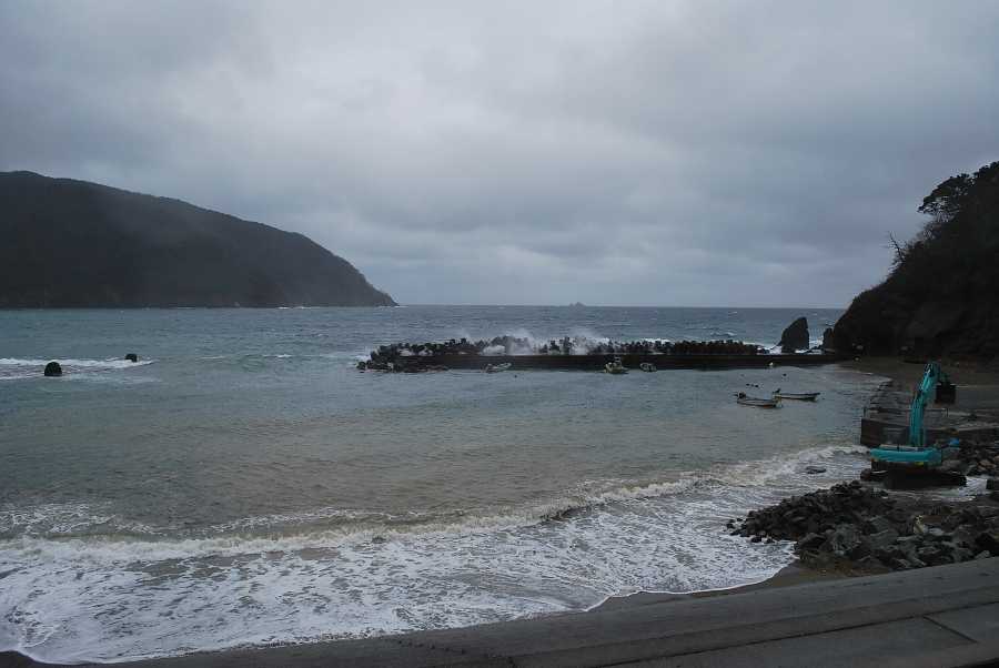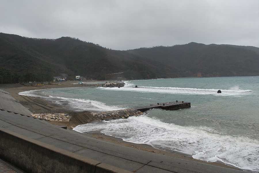 2018年3月9日9時現在は雨で北からの強い風があります。 食見海岸は波高約2.5mの波があり、防波堤に波が被ります。 海水の透明度は波と海岸工事の影響で濁り、海中の様子はほとんど見えません。