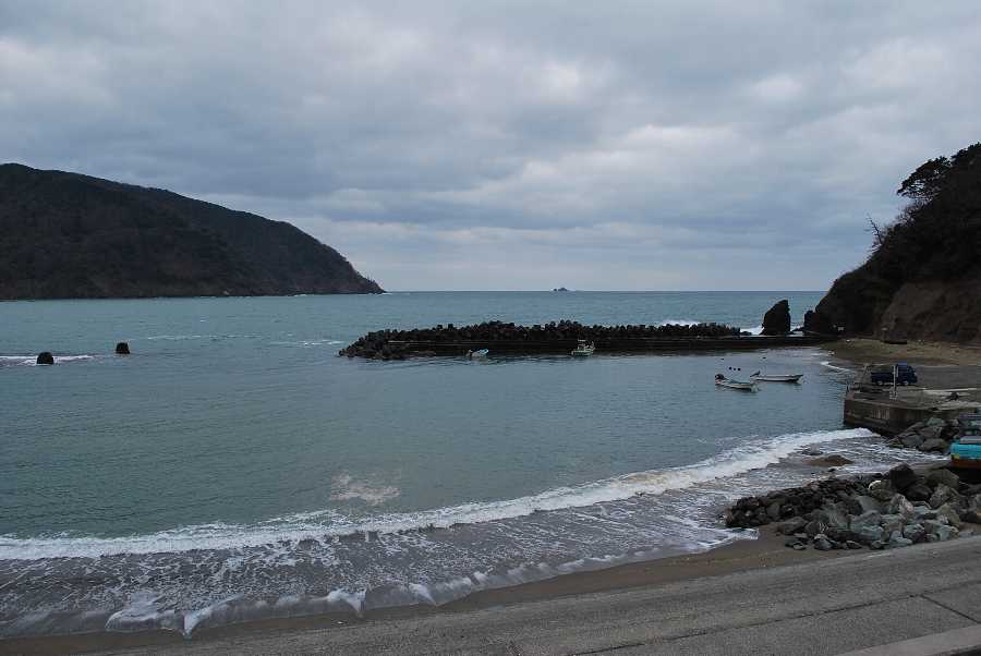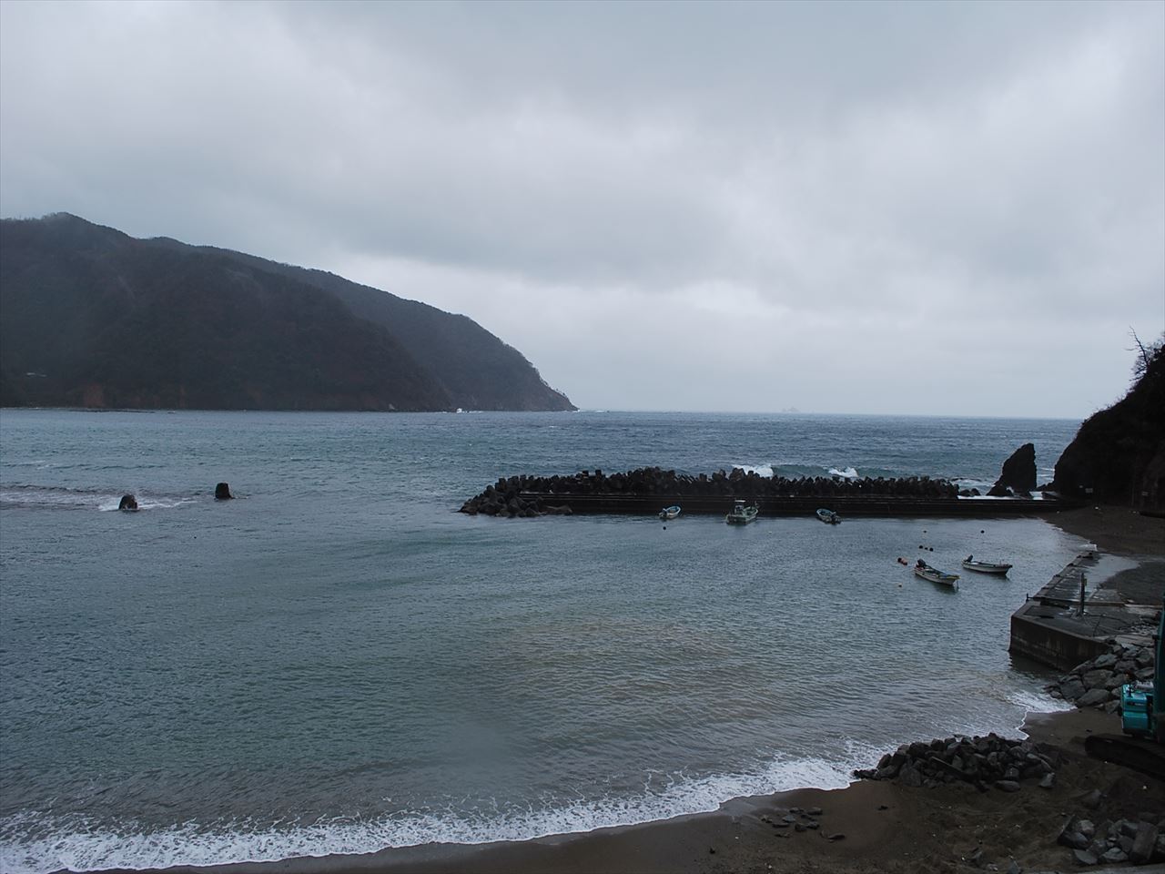 食見海岸は約1mの波があり、時々防波堤の根元に波が被ります。