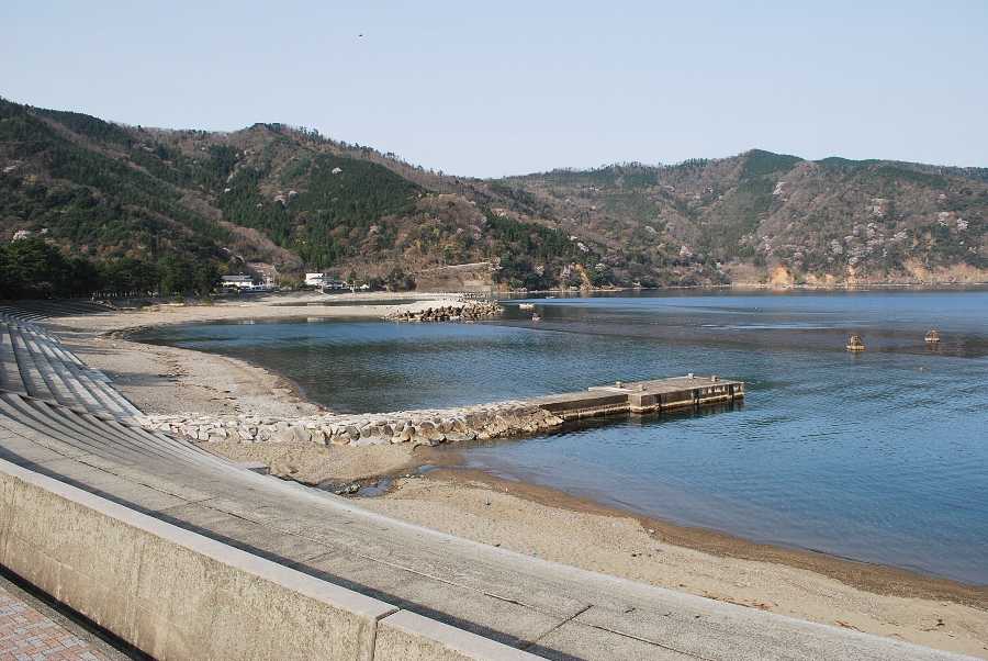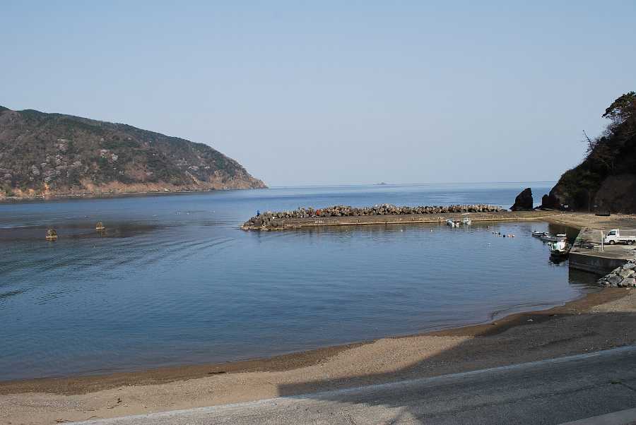 食見海岸は波も無く今日も穏やかな海況になっており、黒崎半島の山桜も咲いております。