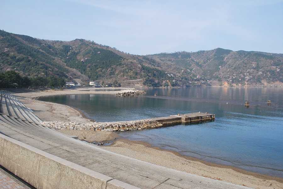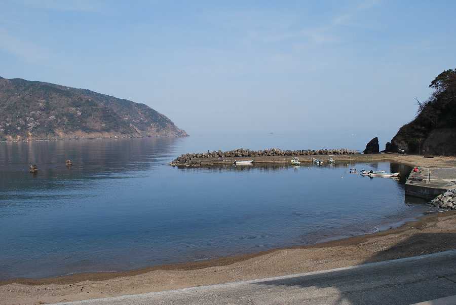 食見海岸は波も無く今日も穏やかな海況になっており、黒崎半島の山桜も先日より鮮やかになっております。