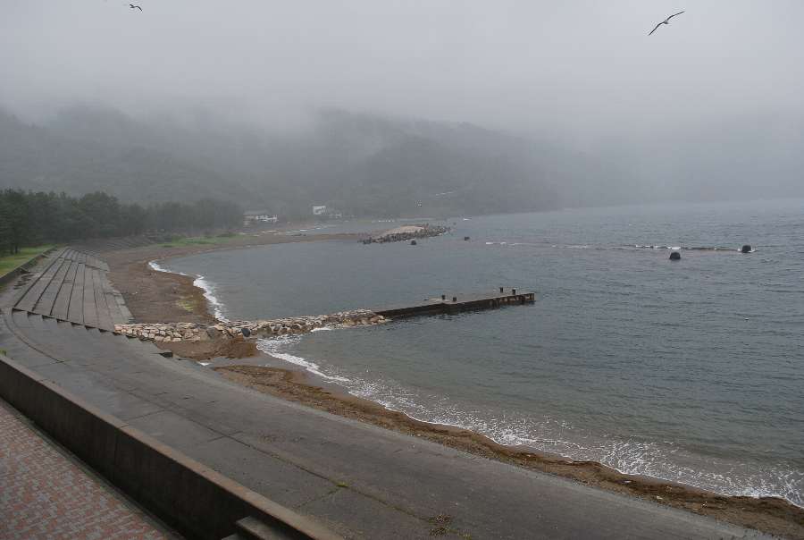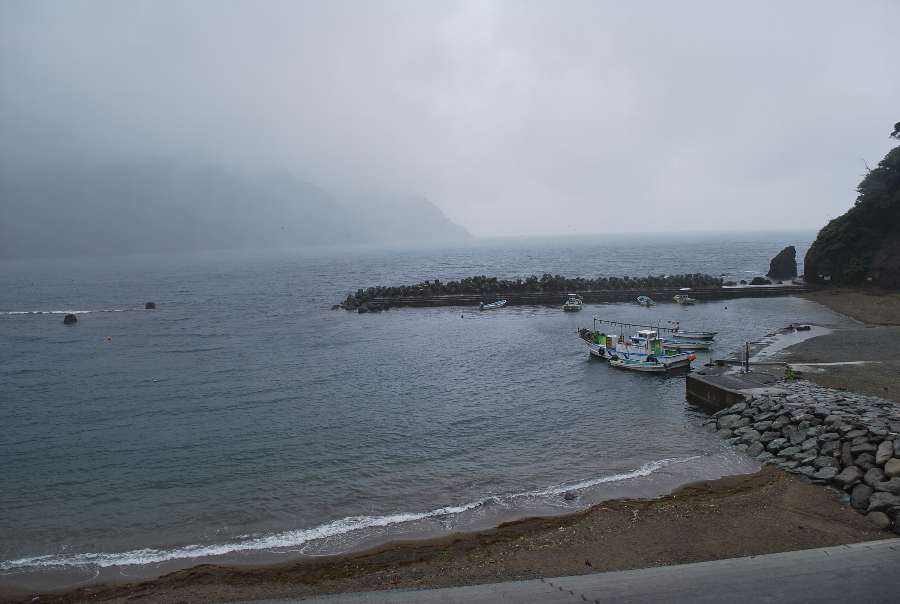 食見海岸は、約1mの波があり、沖合いにある千島は雨で見えなくなっています。