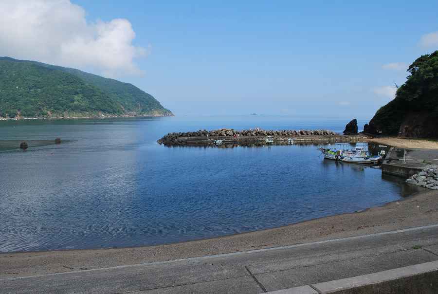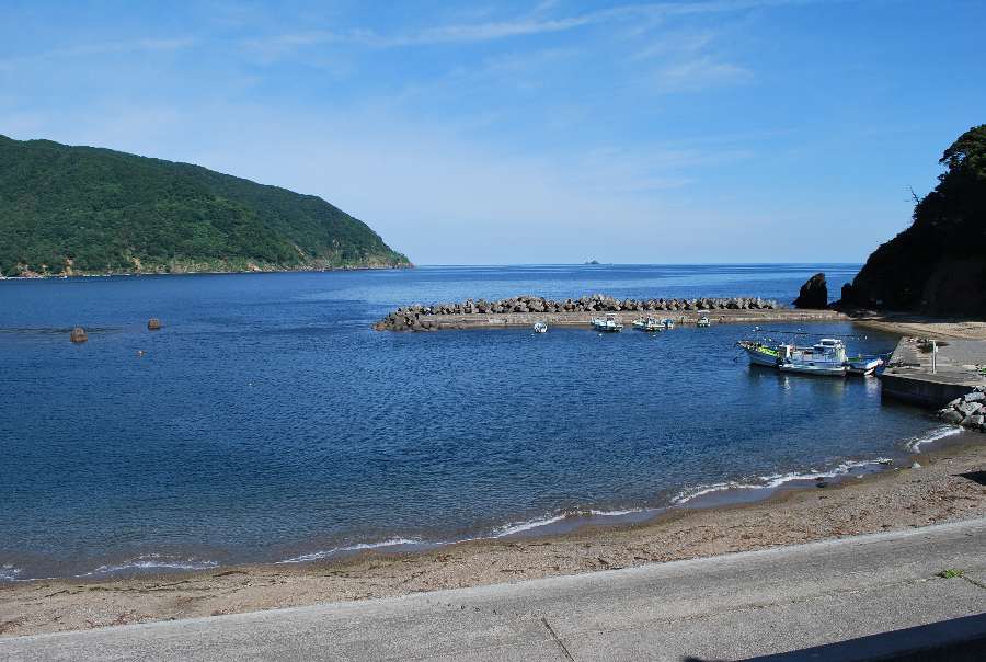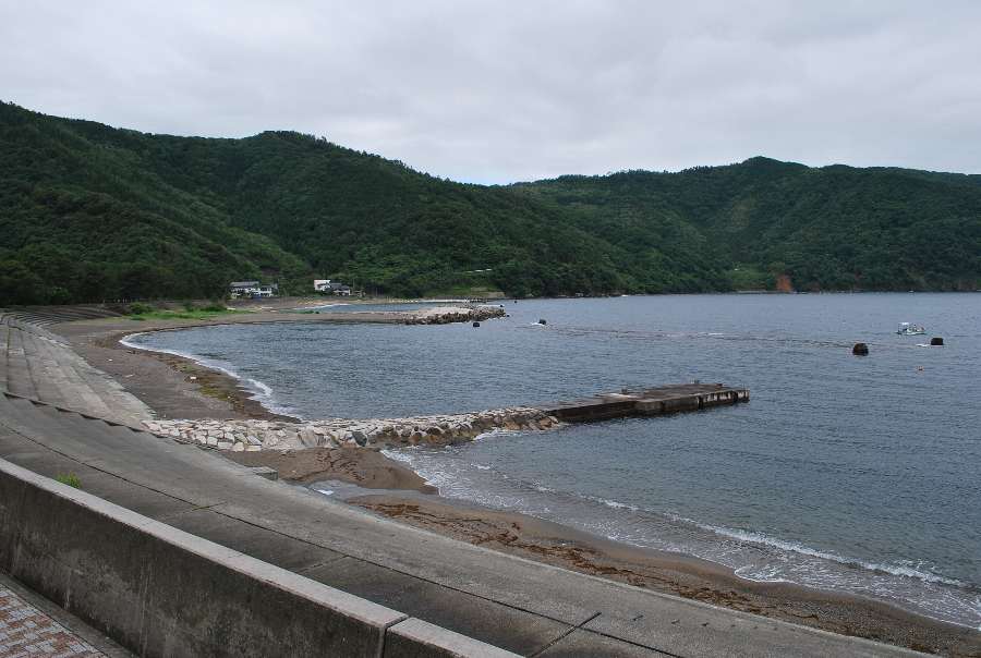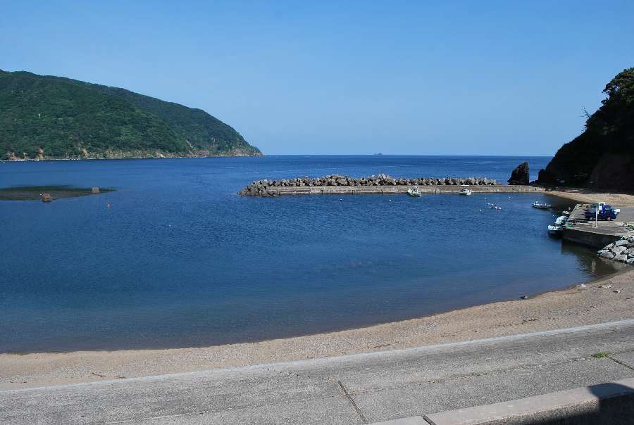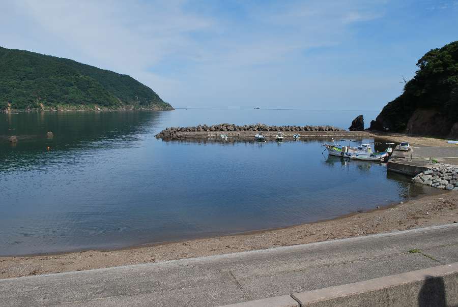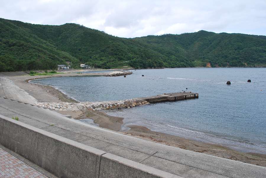 食見海岸は、約1mの波があり防波堤の根元に波が被っています。