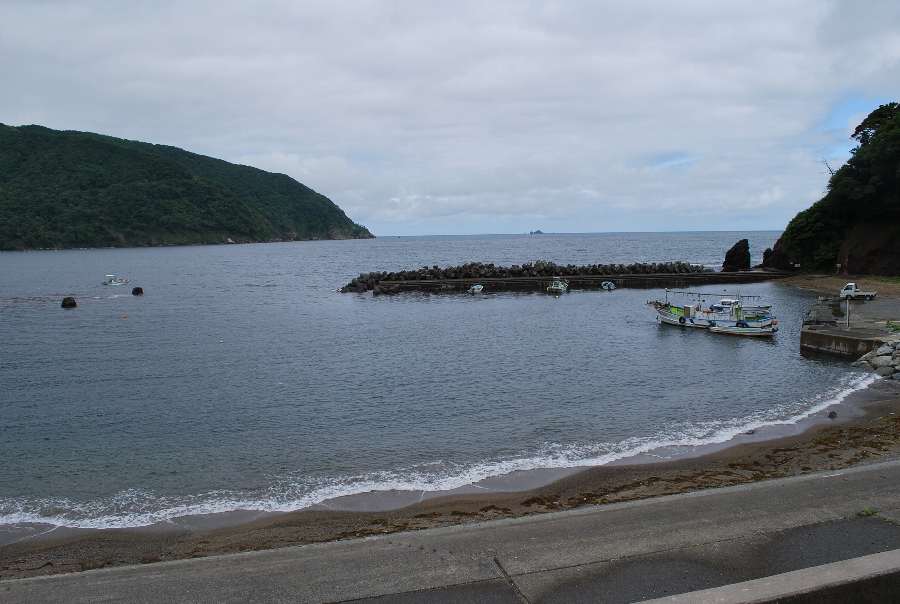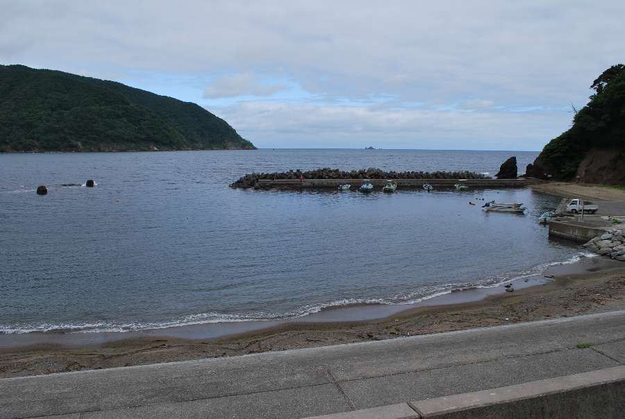 食見海岸は、約1mの波があり、沖合いにある千島は雨で見えなくなっています。