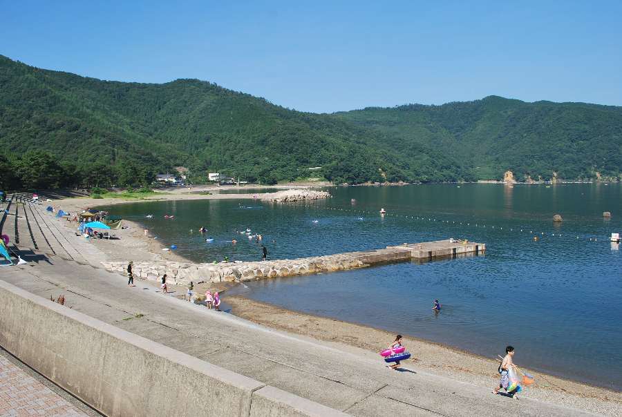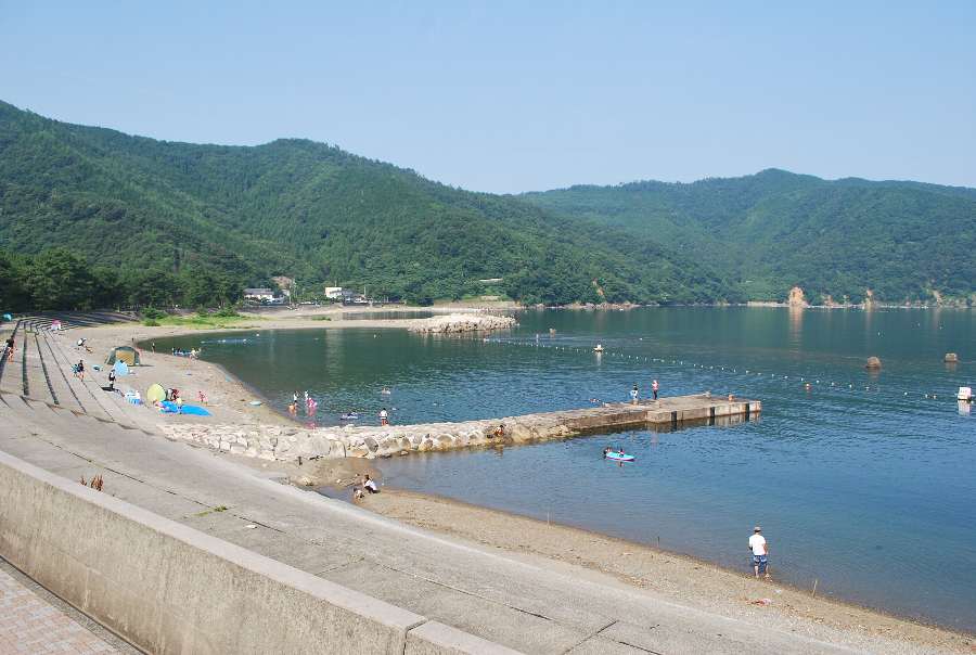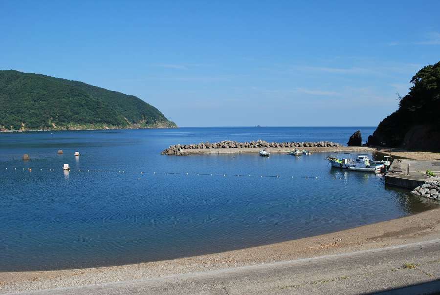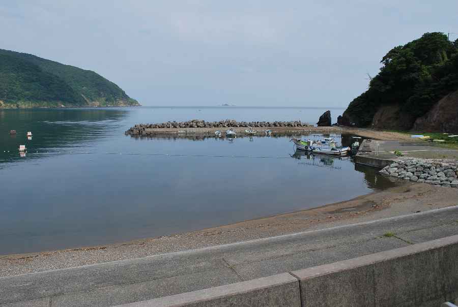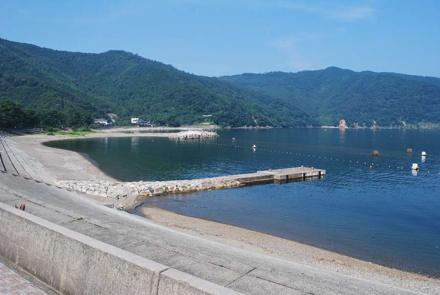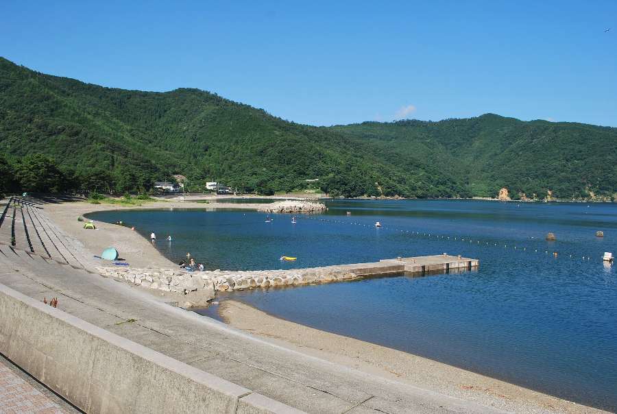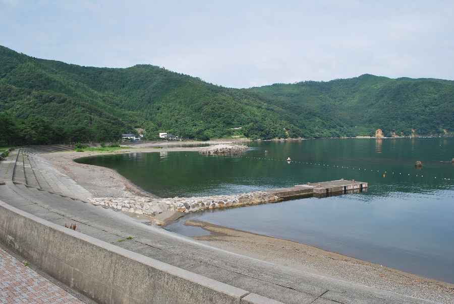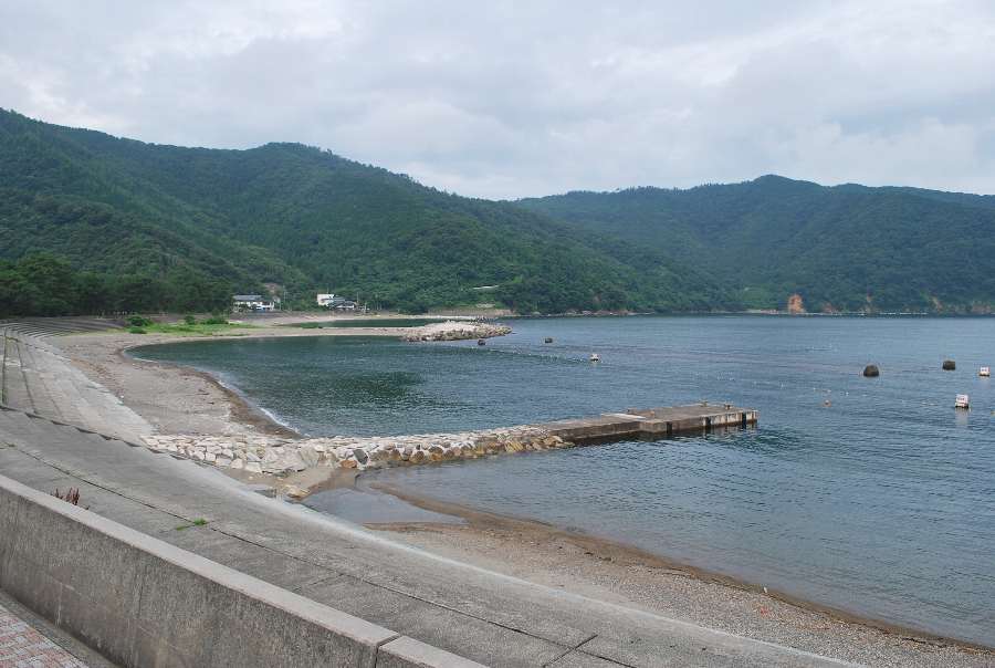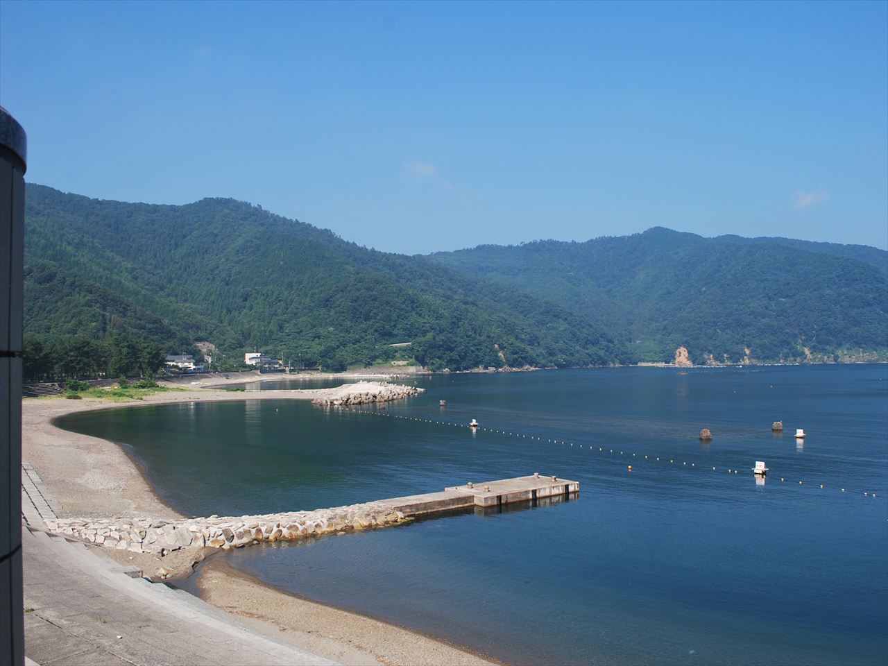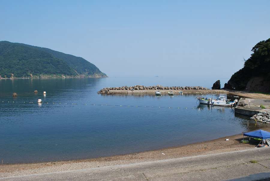 食見海岸は波もなく、穏やかな状態で多くの海水浴客が見えます。