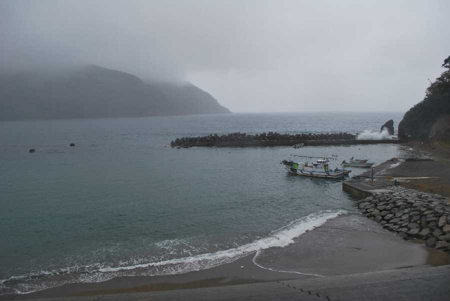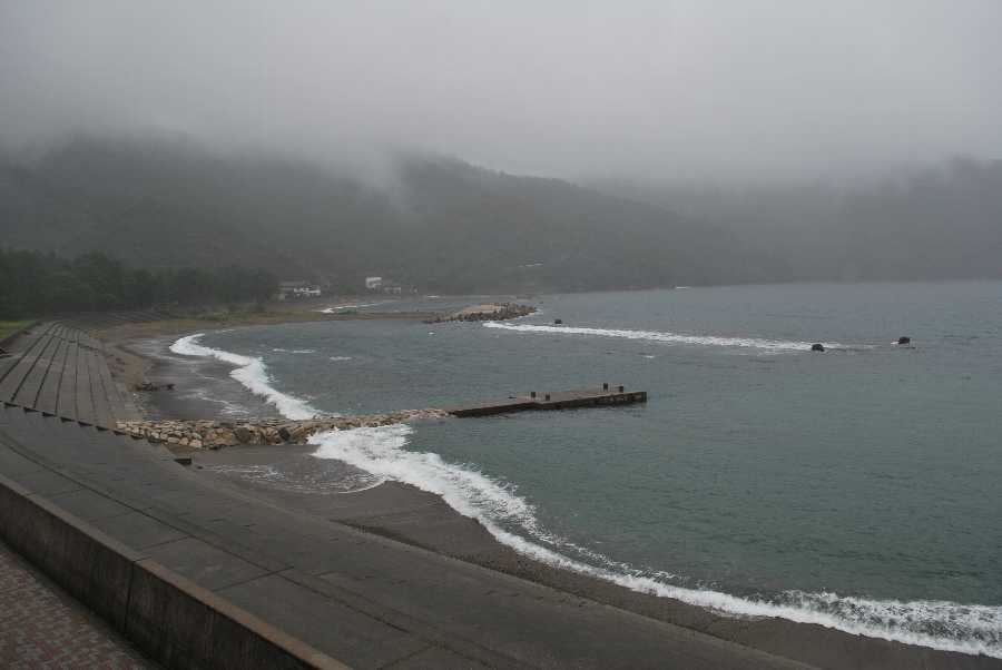 食見海岸は台風25号の影響で波高約2mの波があり防波堤に波が被っています。