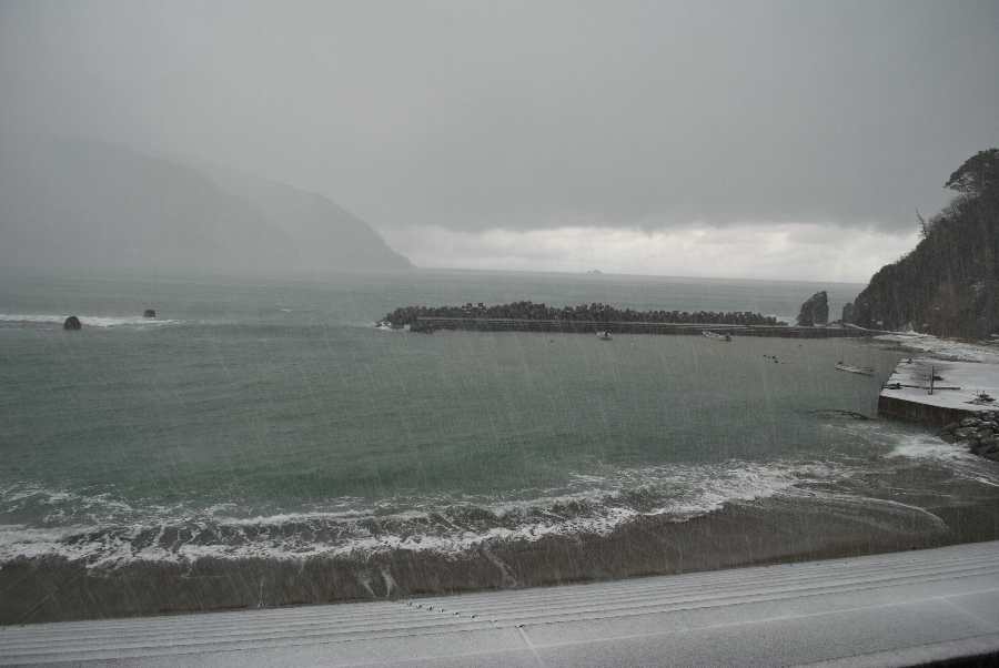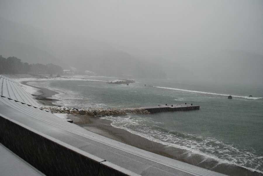 2018年12月9日9時現在は、雪で強い北西の風があります。 食見海岸は約1cm雪が積もっていて、約3mの波があります。 透明度は低く、海中の様子が見えません。