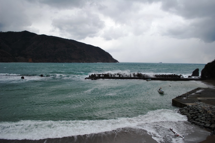 食見海岸は約3mの波があり、消波ブロックに勢いよくかかった波が