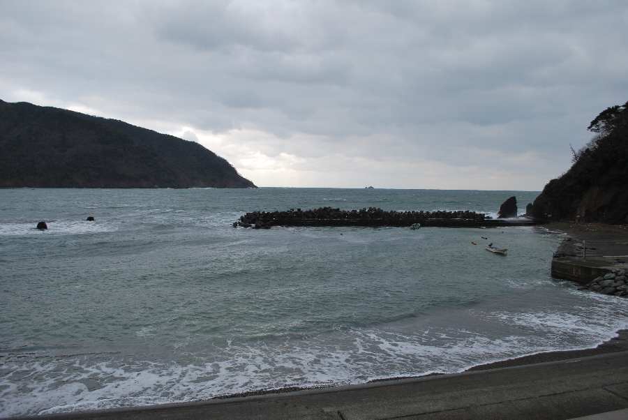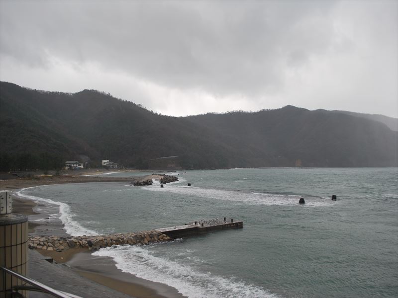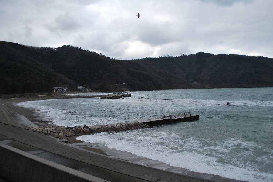 食見海岸は積雪も無く約2.5mの波があり、防波堤に大波が被っています。