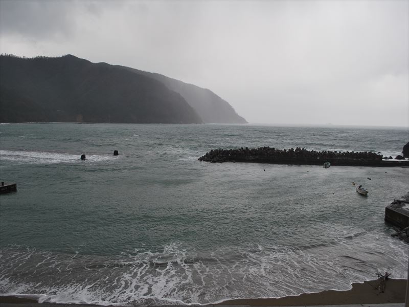 食見海岸は約1.5mの波があり、防波堤に波が被っています。次第に波が高くなる予報です。