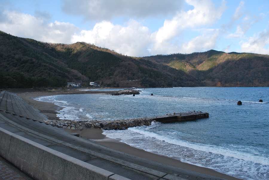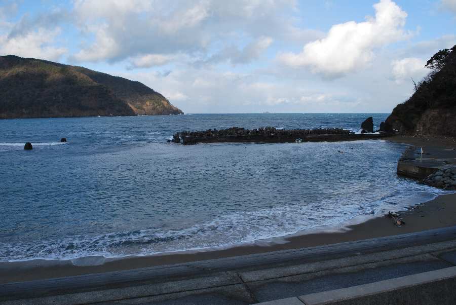 食見海岸は約2.5mの波があり、大波が防波堤に被っています。