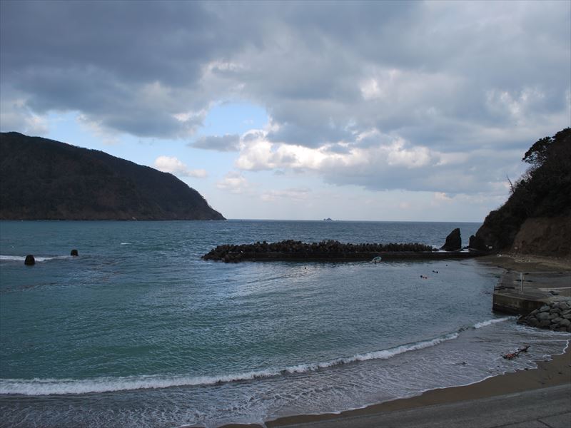 2019年2月5日9時現在は、曇で弱い北の風が吹いています。食見海岸は1.5m程度の波があります。海水の透明度は低く、海底の様子は見えません。