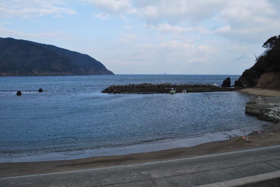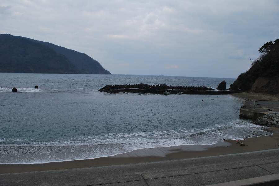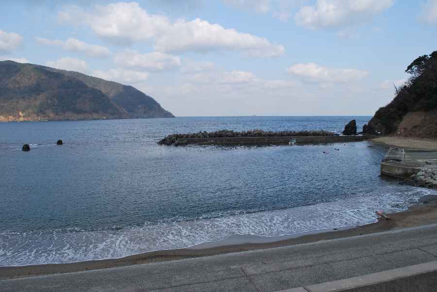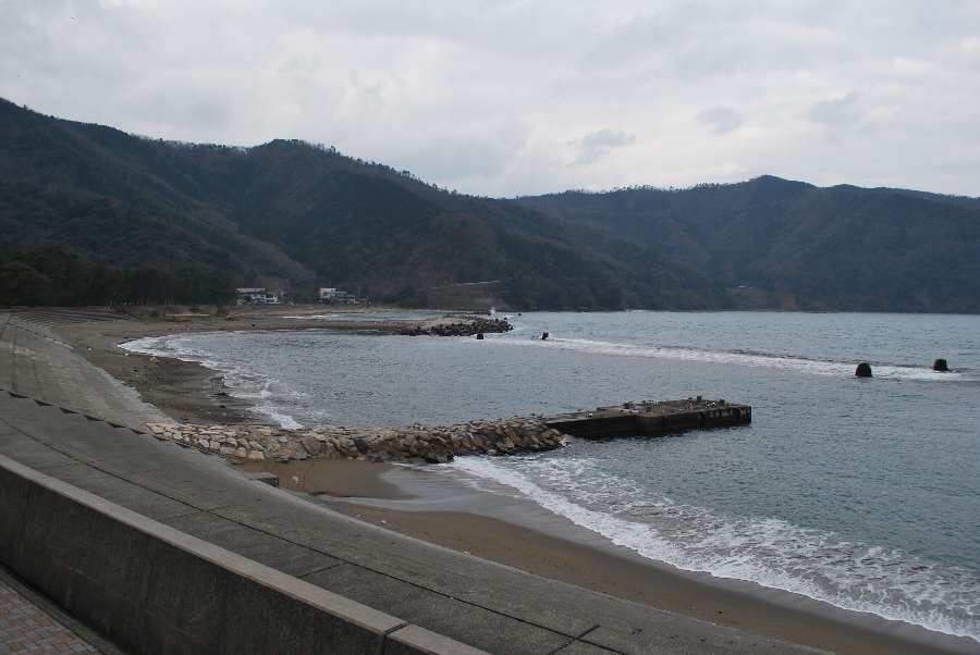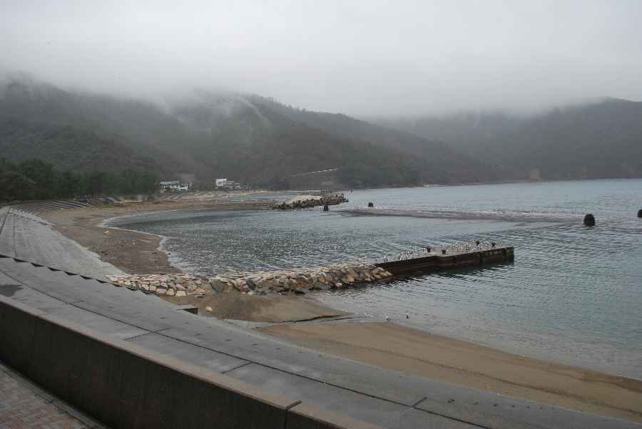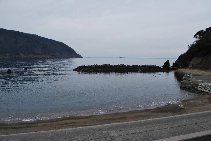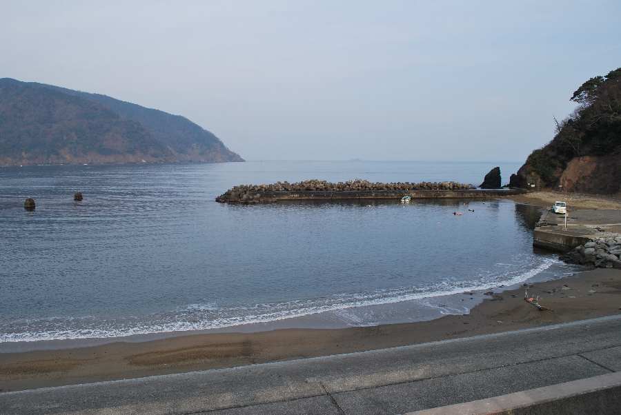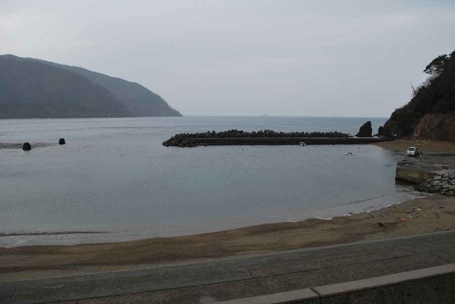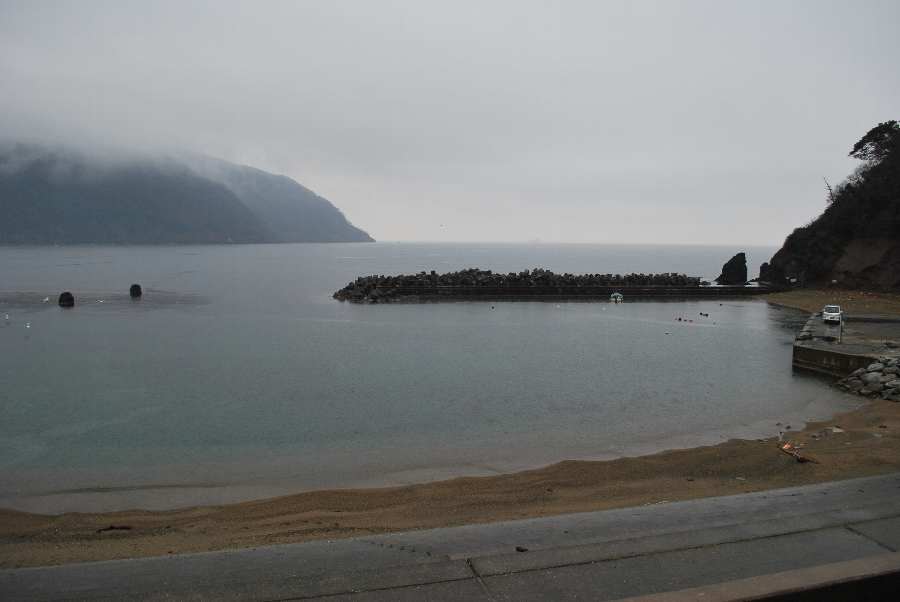 食見海岸は約0.5mの波があり、防波堤の根元に波しぶきがかかります。