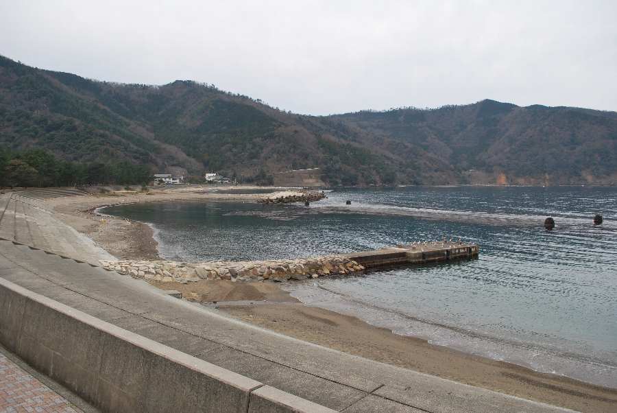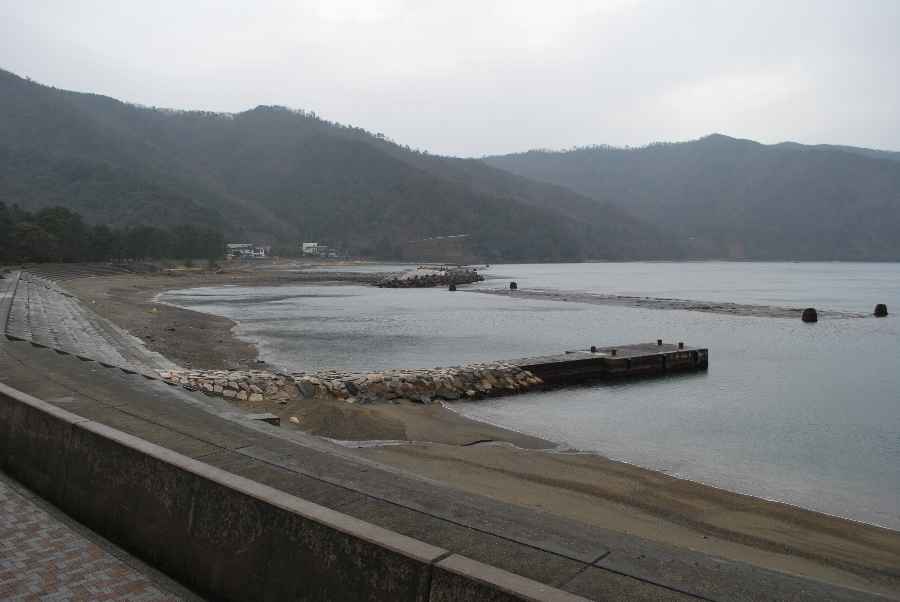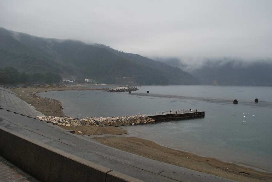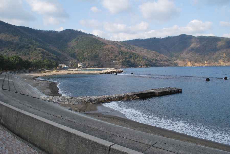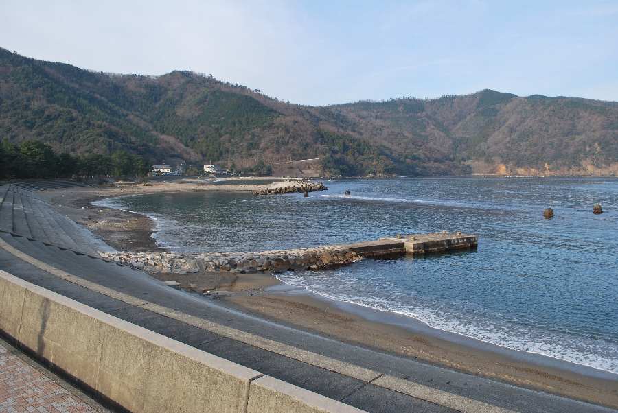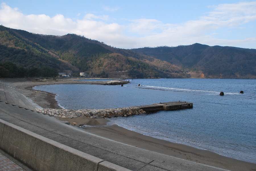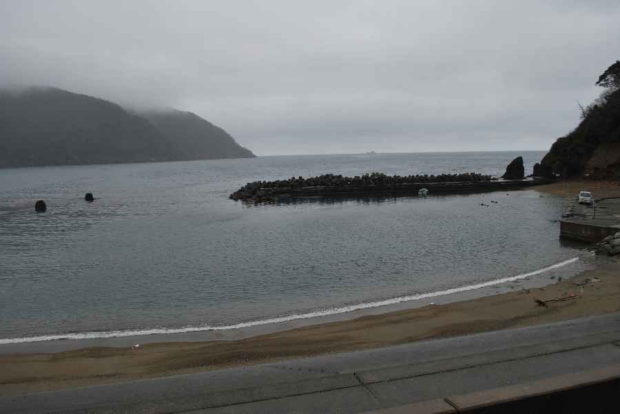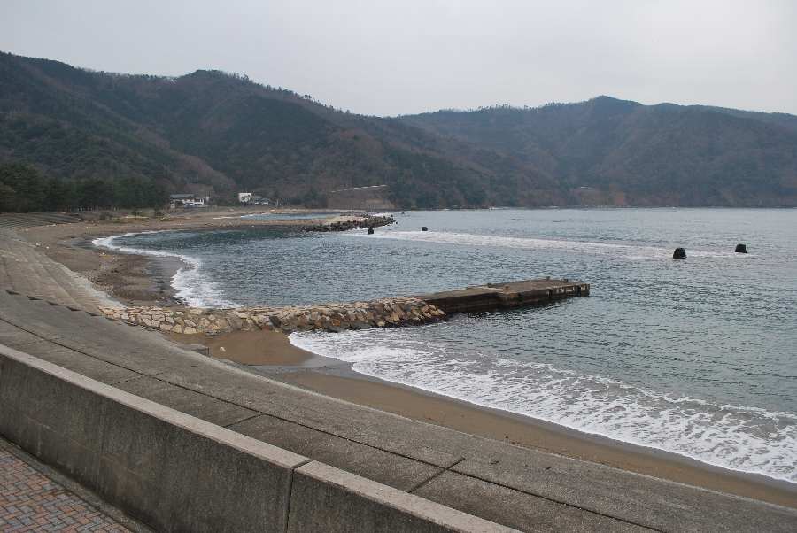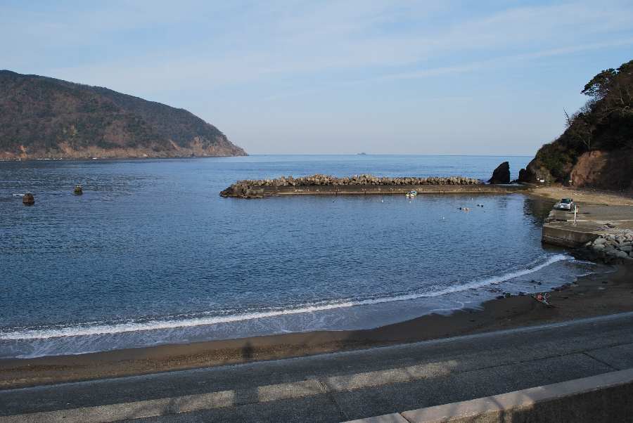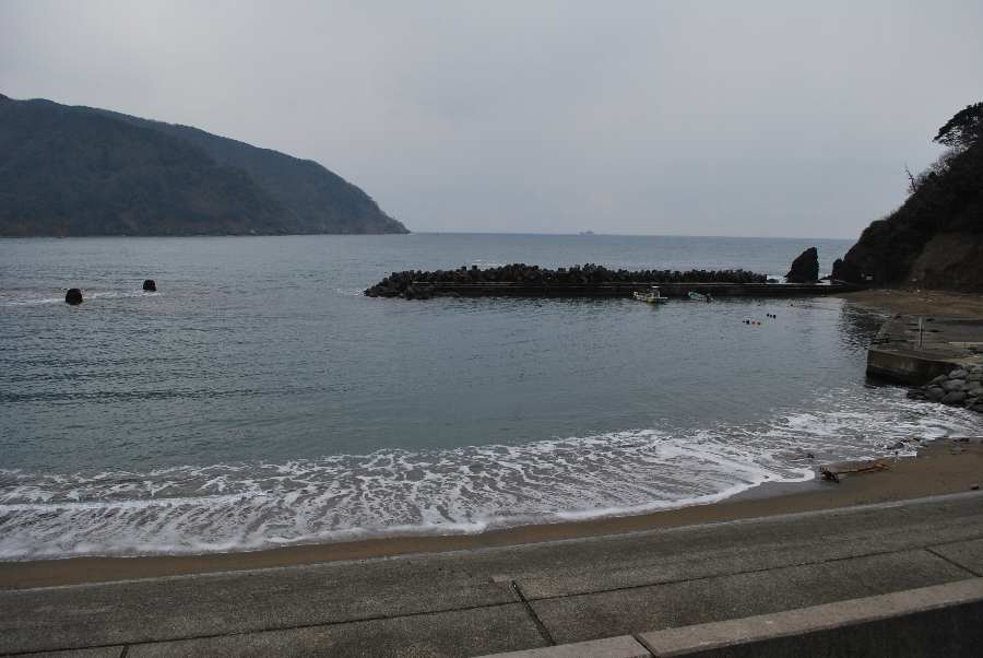 食見海岸は約0.5mの波があり、防波堤の根元に波しぶきがかかります。