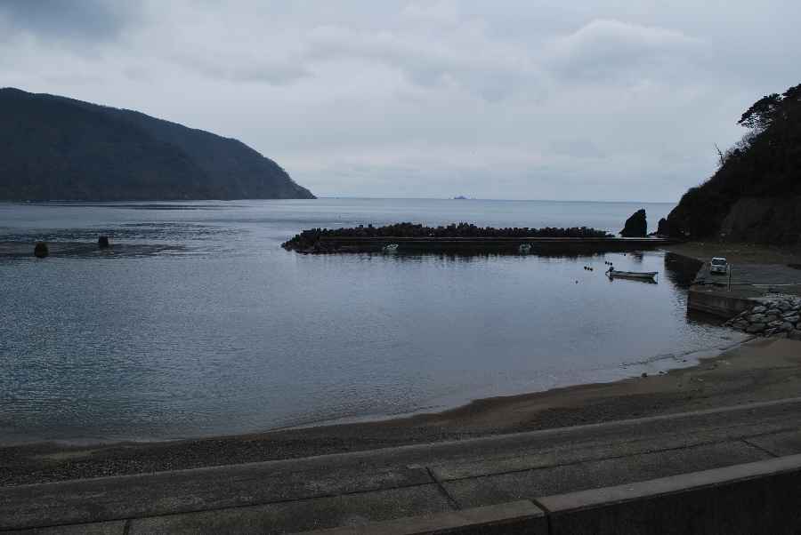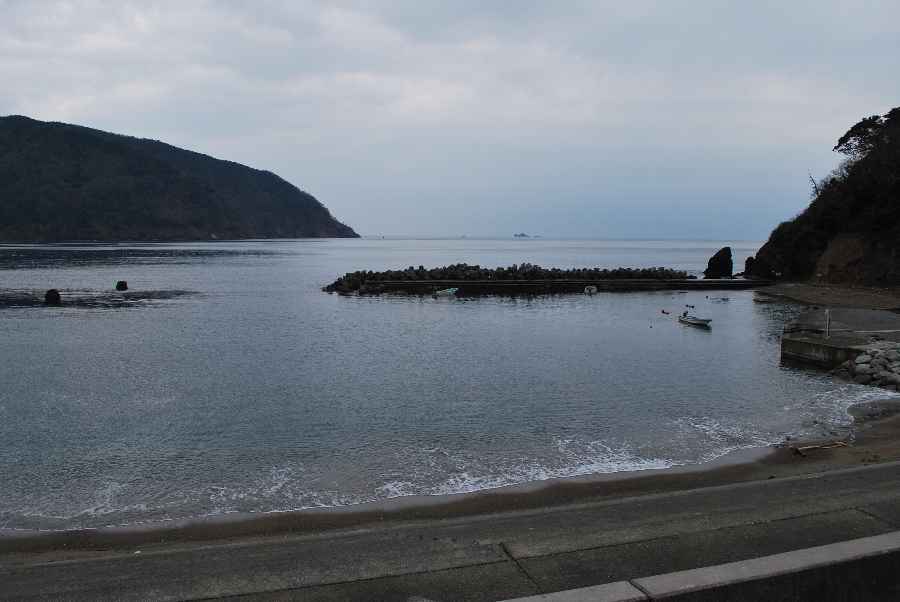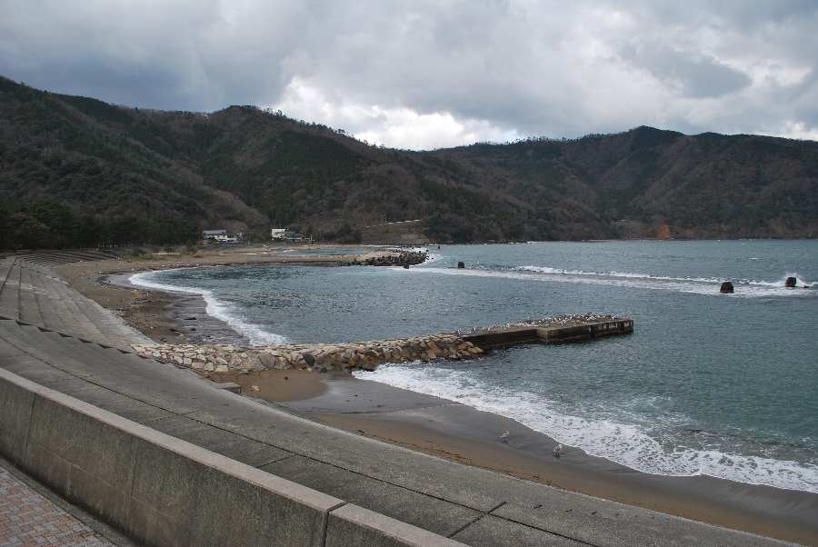 食見海岸は約1mの波があり、時々防波堤に波が被っています。また突堤にカモメ類が群れています。