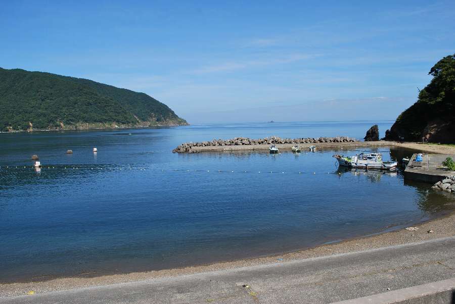 食見海岸は約1mの波があり、時々防波堤に波が被っています。