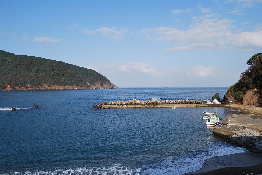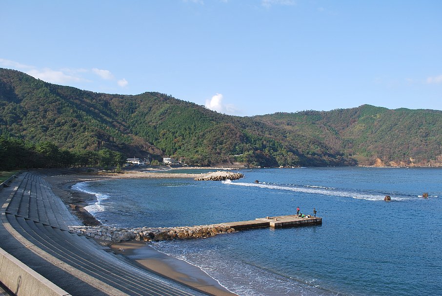 食見海岸は約1.5mの波があり、時々防波堤に波がかかります。