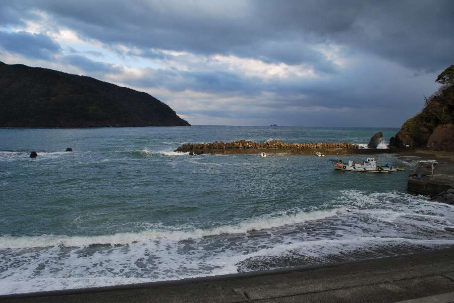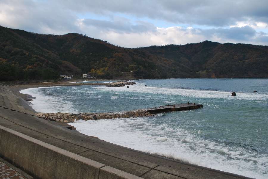 食見海岸は約2.5mの波があり、防波堤に波が被ります。