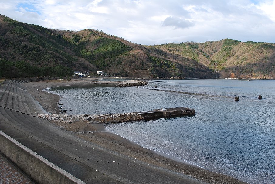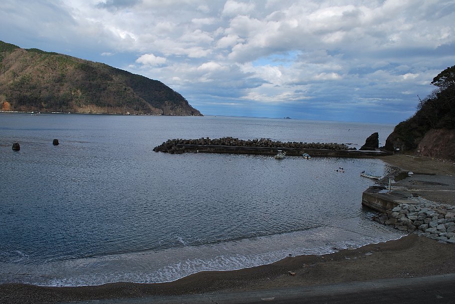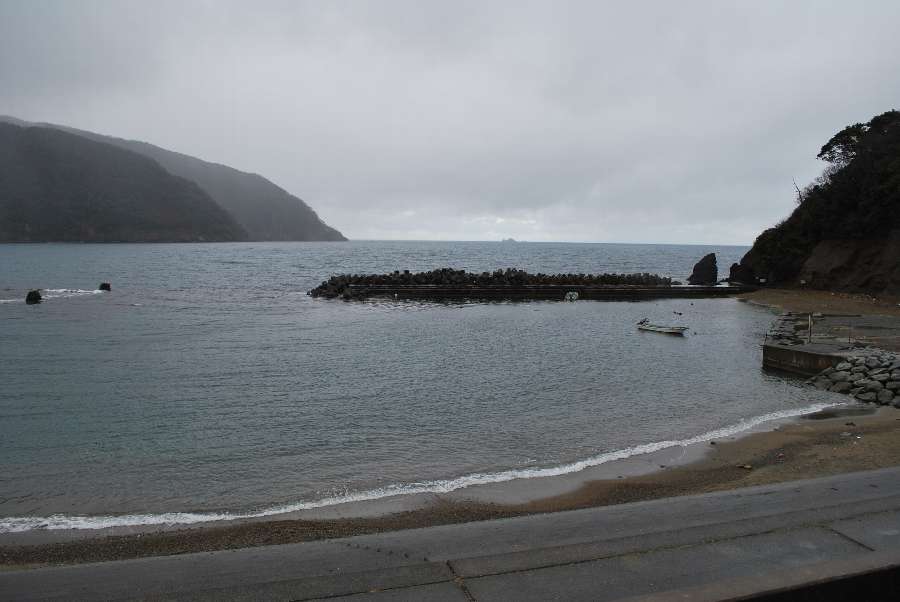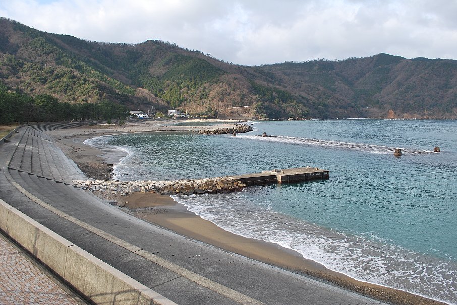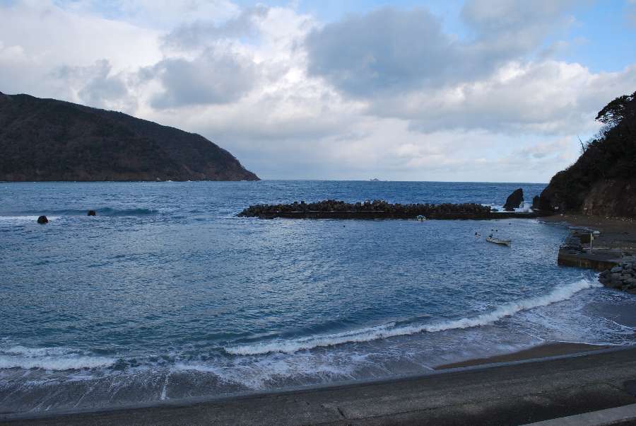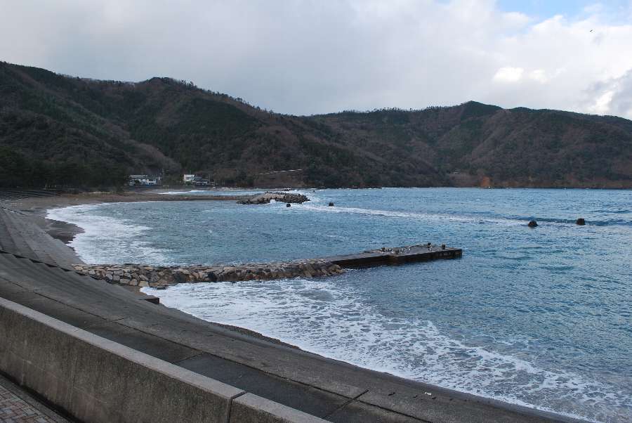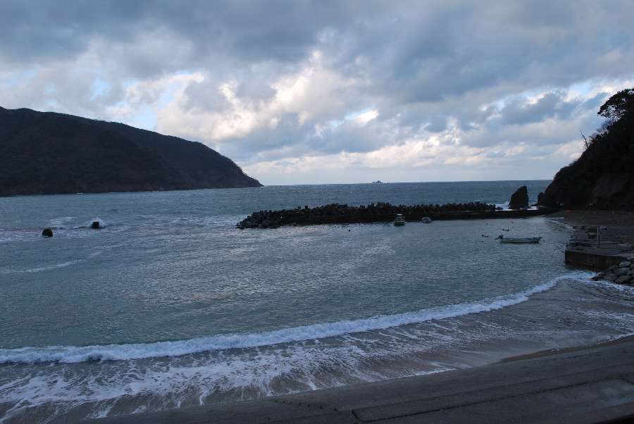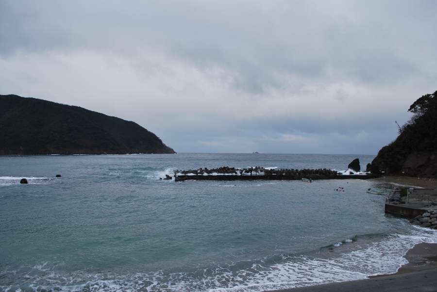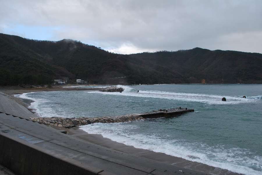 食見海岸は約1.5mの波があり、時折波が防波堤を打ち付けます。