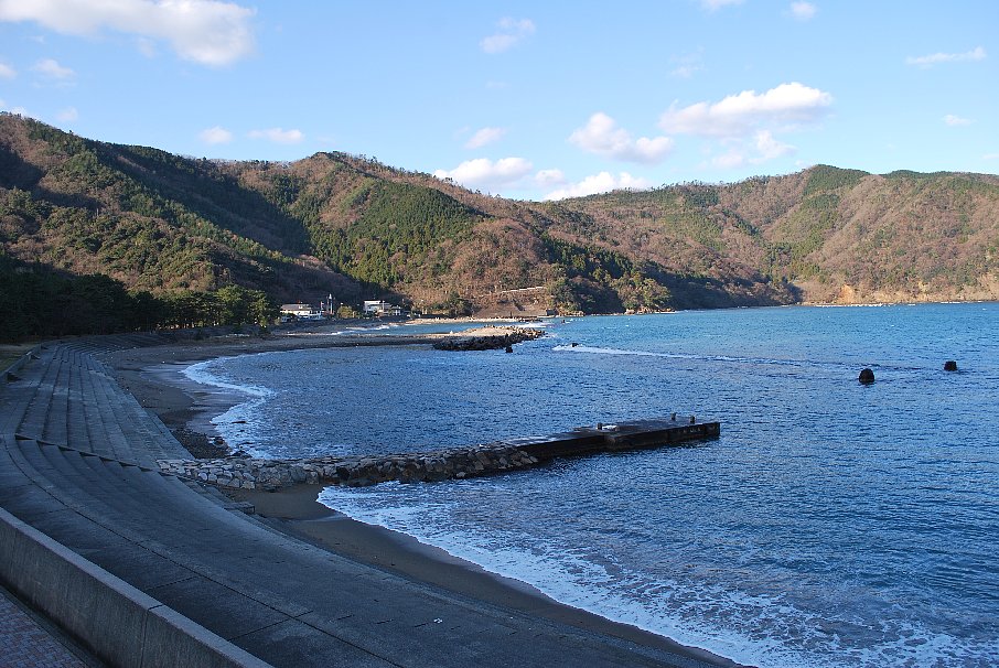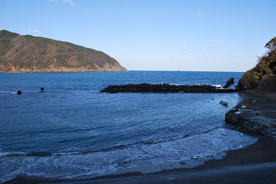 食見海岸は約1.5mの波があり、時々防波堤に波が打ちつけます。