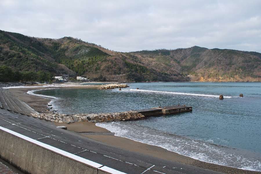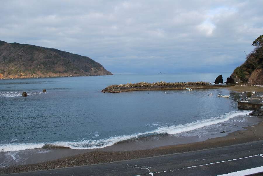 食見海岸は約1.5mの波があり、時々防波堤の根元に波が被ります。