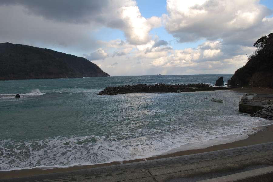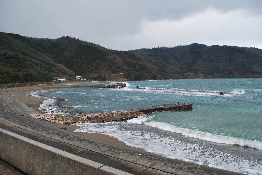 食見海岸は約2.5mの波があり、防波堤に大波が被ります。