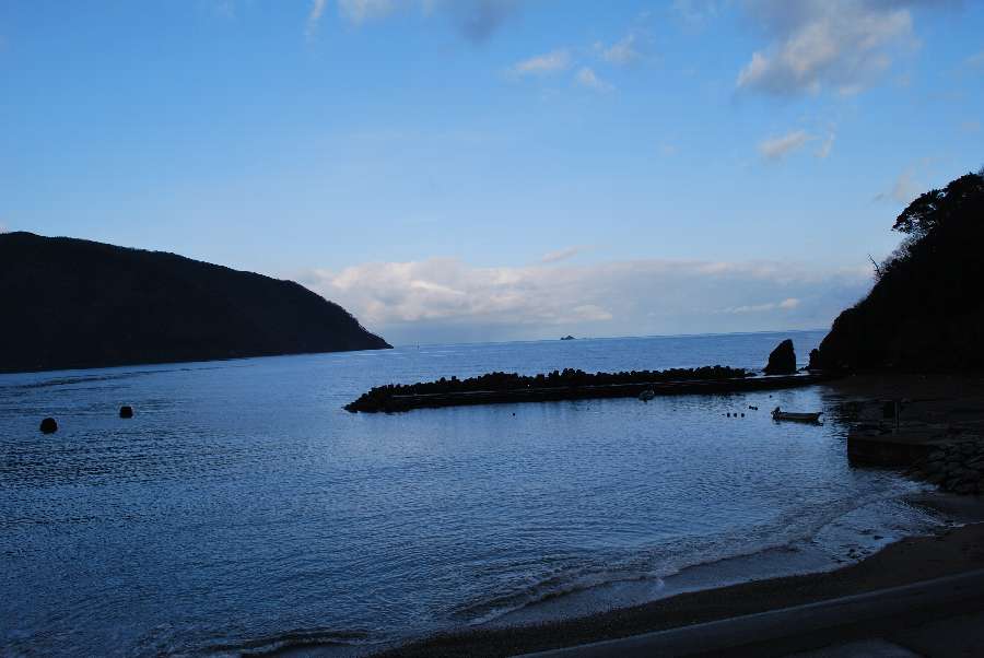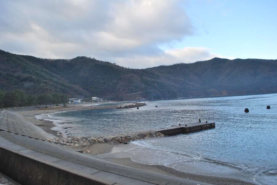 食見海岸は約1.5mの波があり、時々防波堤に波が打ちつけます。
