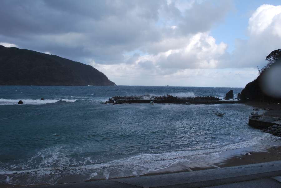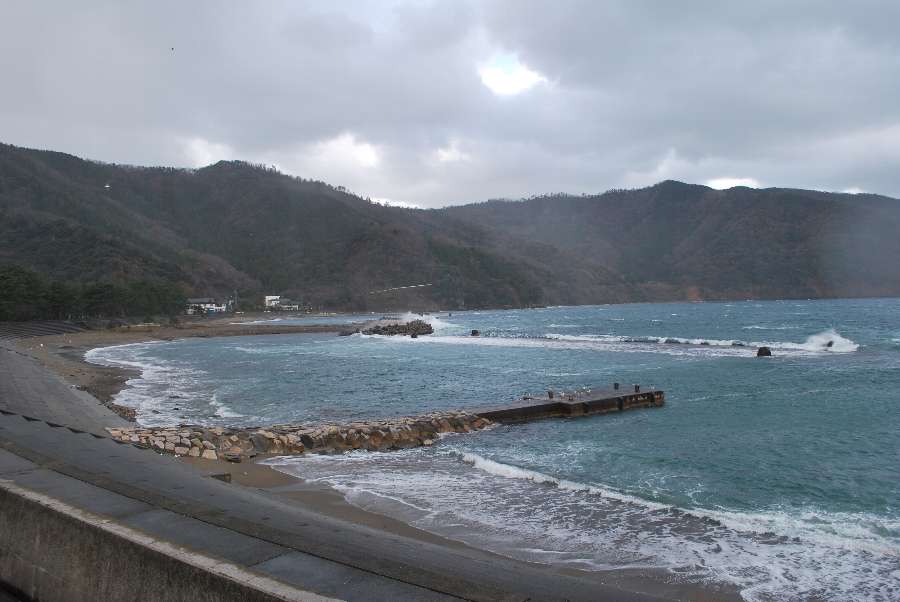 2020年3月5日9時現在は、みぞれ交じりの雨で強い北西の風が吹いています。 食見海岸は約2.5mの波があり、防波堤に大波が被っています。 海水の透明度は低く、波の影響で濁り海中の様子が見えにくいです。