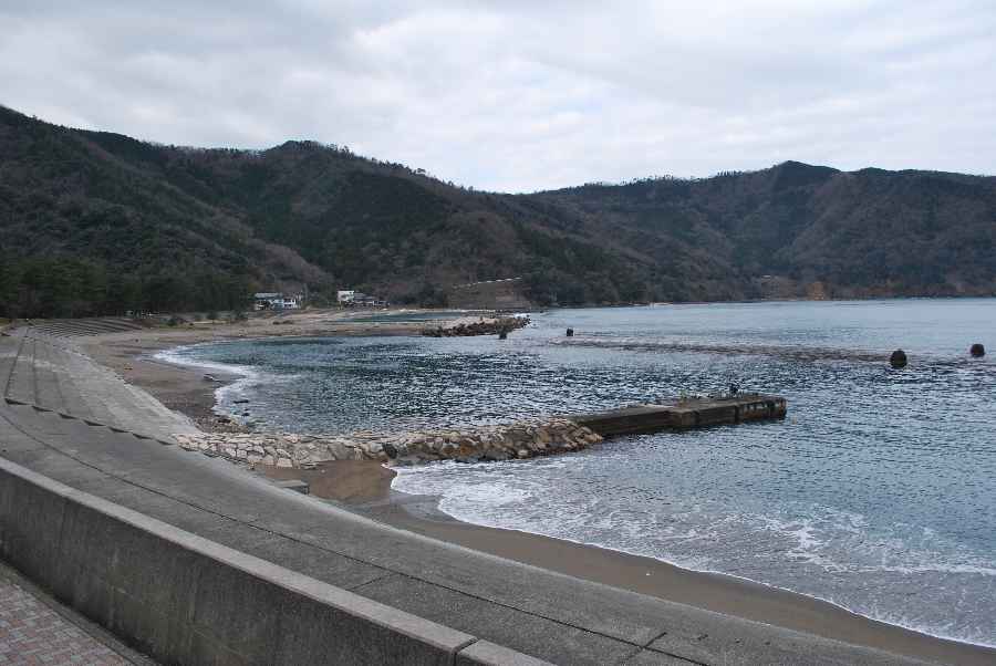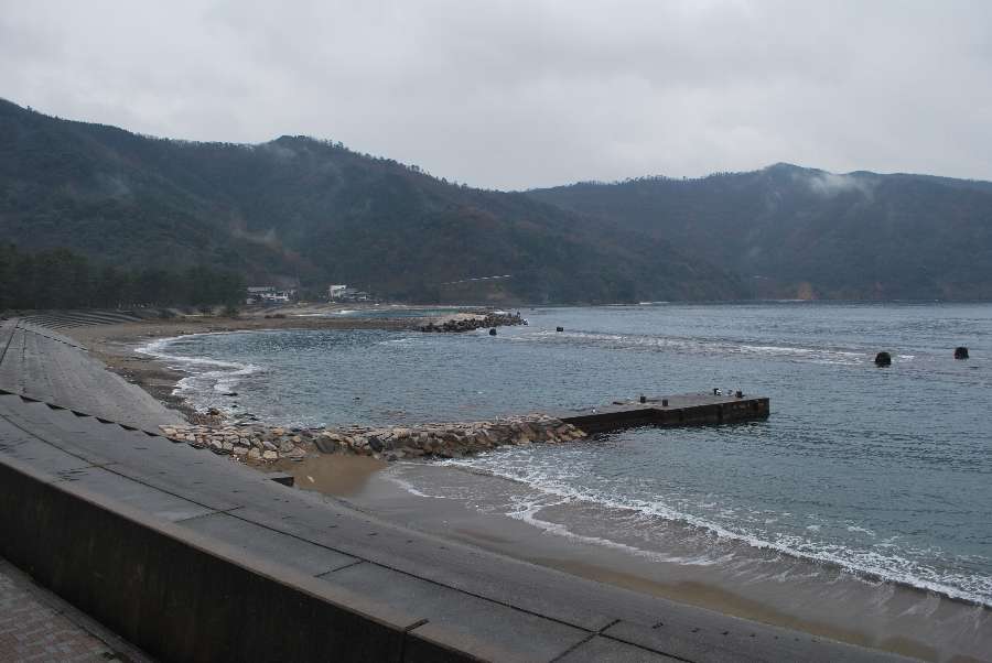 食見海岸は約1mの波があり、時々防波堤の根元に波が被ります。