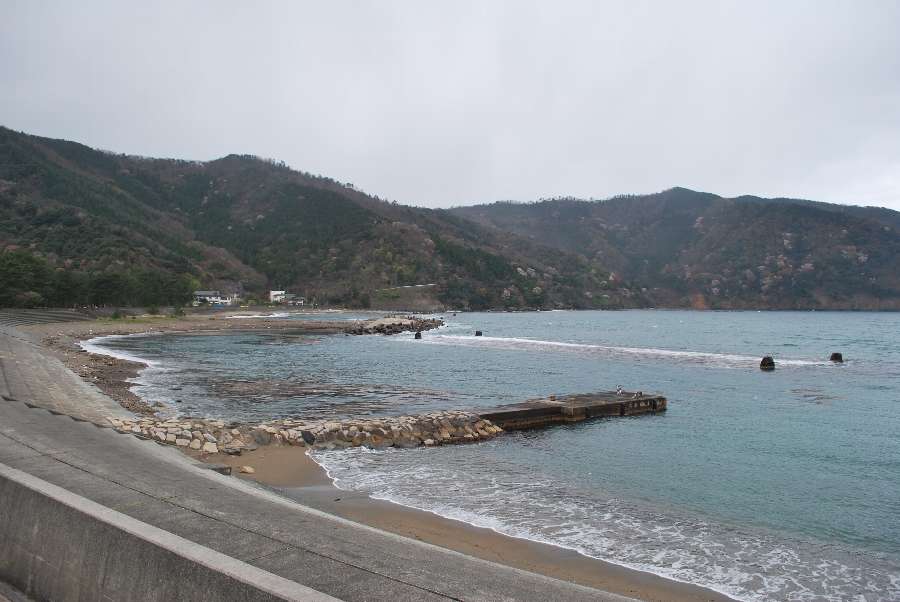 食見海岸は約2mの波があり、時々防波堤に波が被っています。