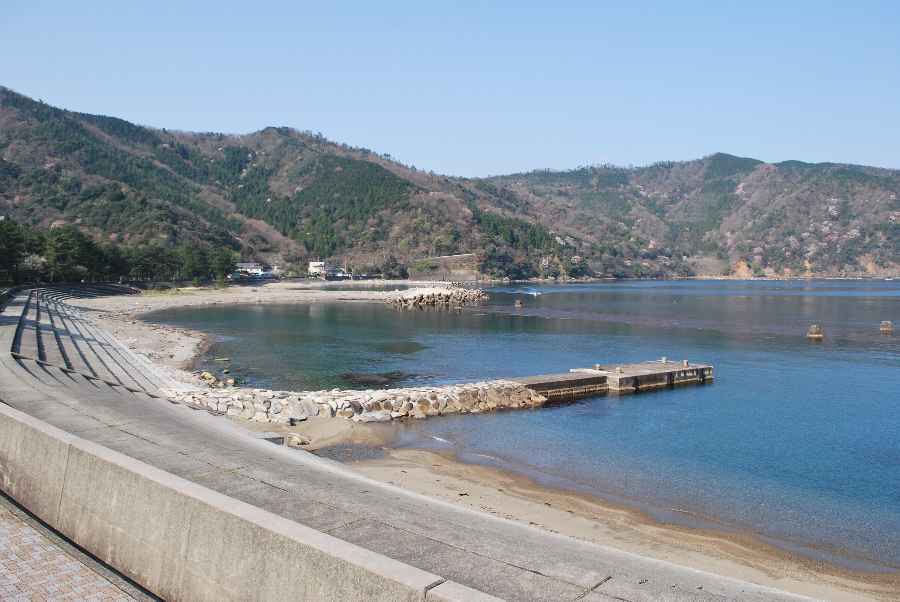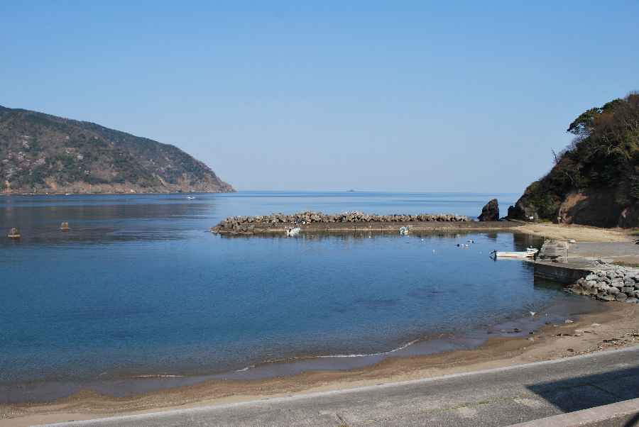 食見海岸は約1.5mの波があり、防波堤の根元に波がかぶります。