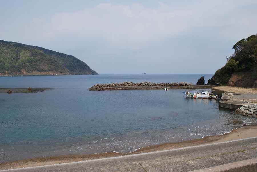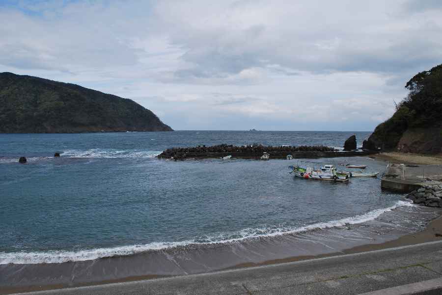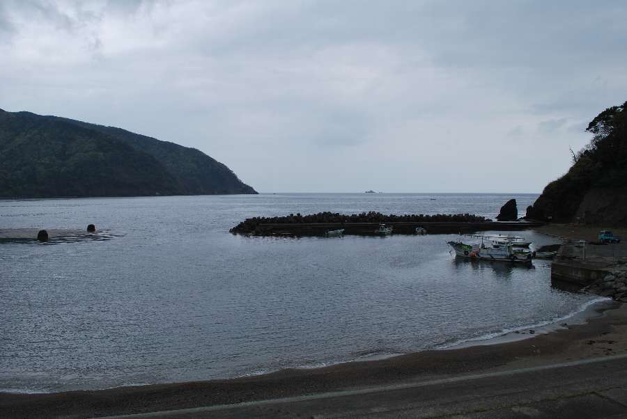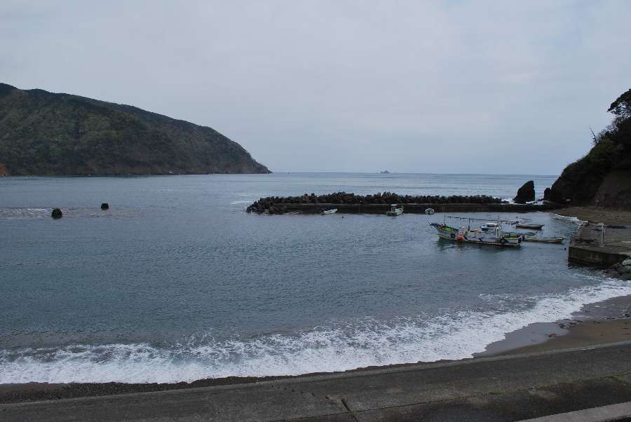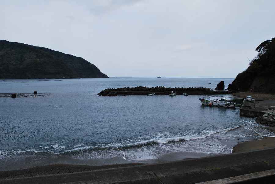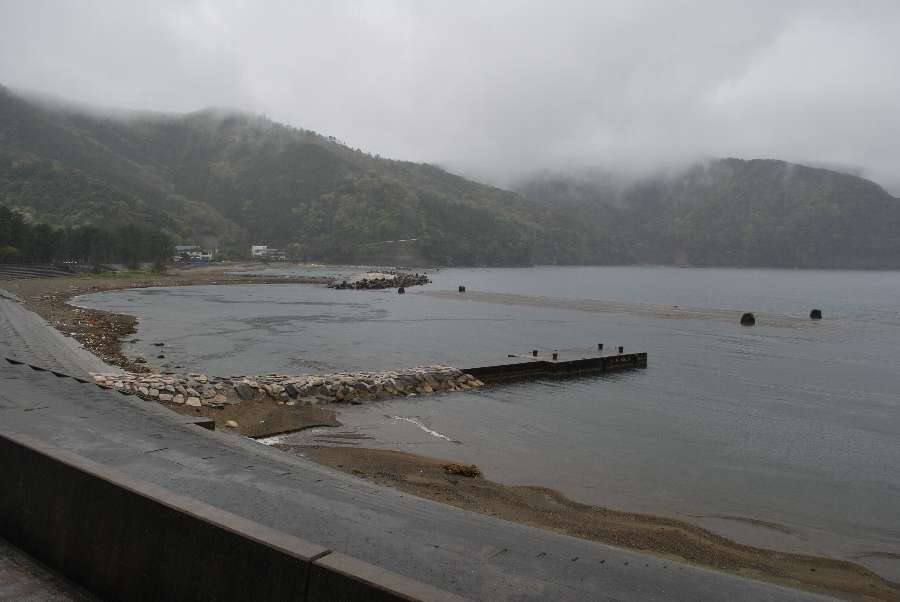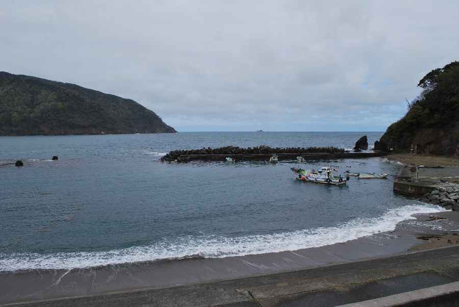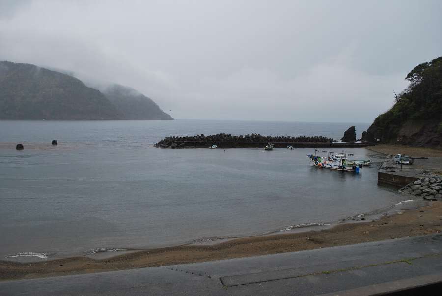 食見海岸は約0.5mの波があり、沖合いの千島が雨で見えなくなっています。