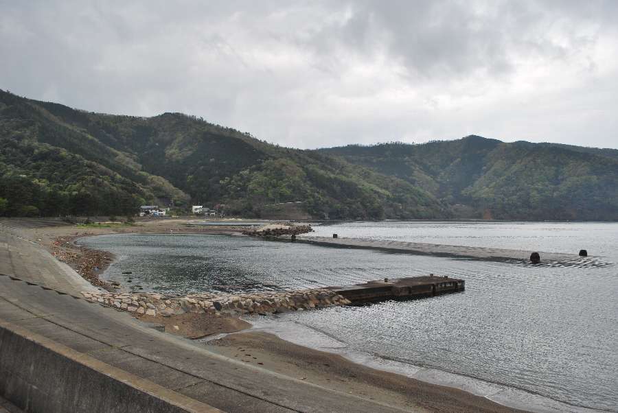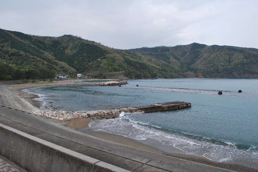 食見海岸は約1mの波があり、時々防波堤に波が被っています。