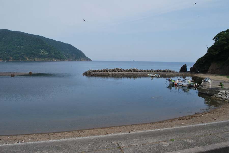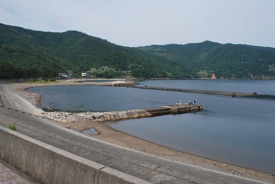 2020年6月9日9時現在は、雲が多い晴れで弱い南の風があります。 食見海岸は、波もなく穏やかな海況です。 海水の透明度は港内が薄く緑がかっていますが高く、アゴハゼが泳いでいるのが見えます。