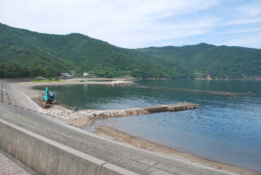 食見海岸は、波もなく穏やかな海況で、砂浜の砂を足すために工事車両が入っています。