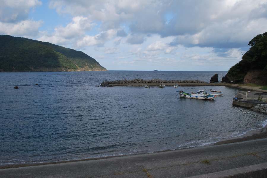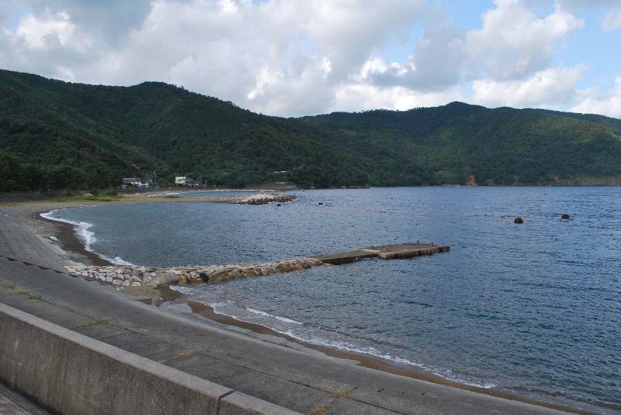 食見海岸は約1mの波があり、時々防波堤の根元に波が被っています。
