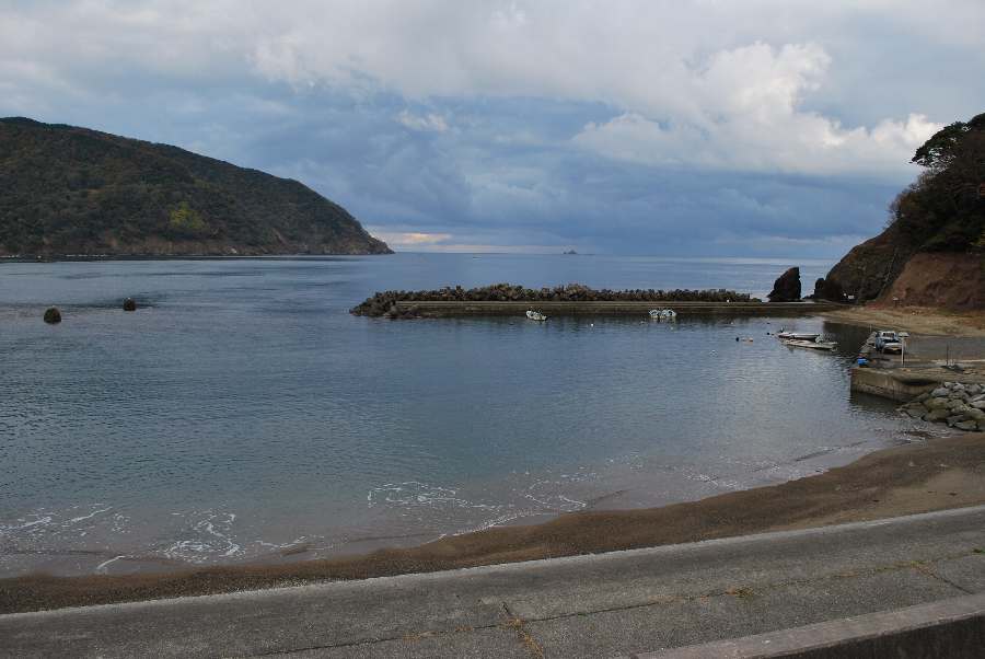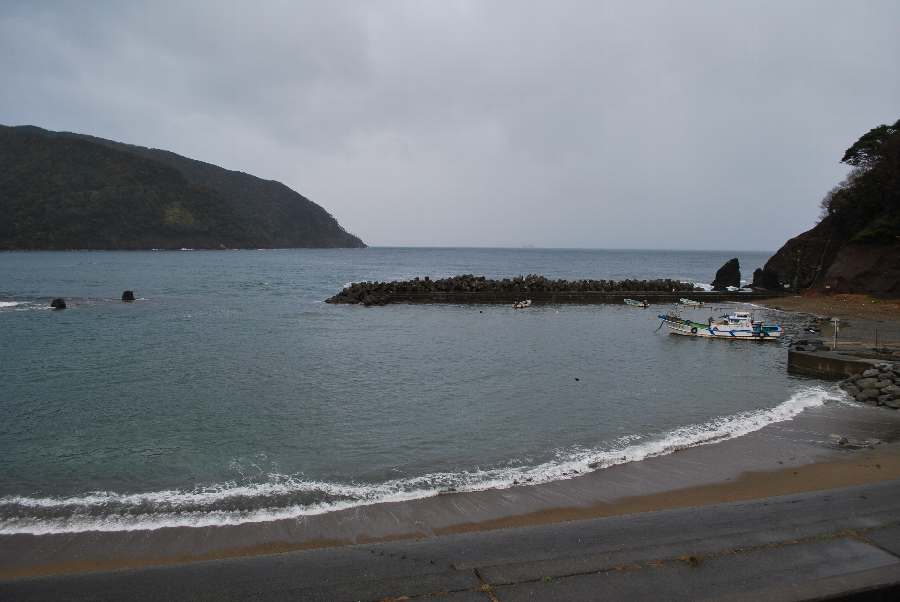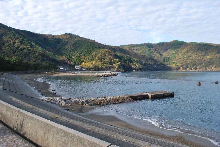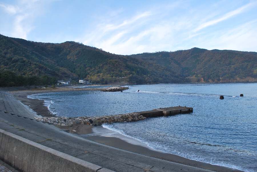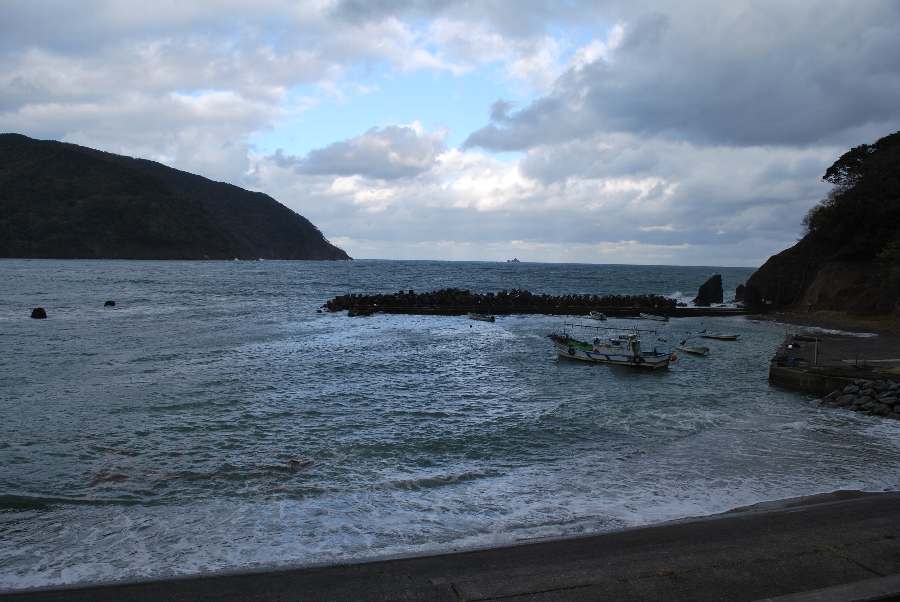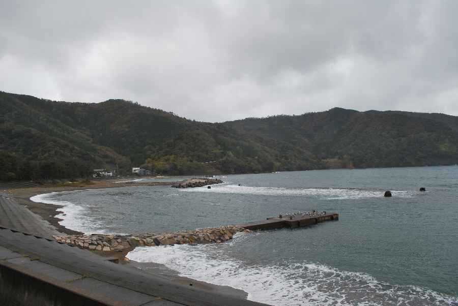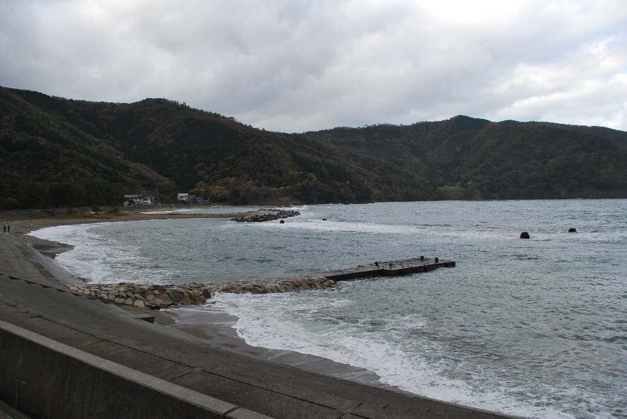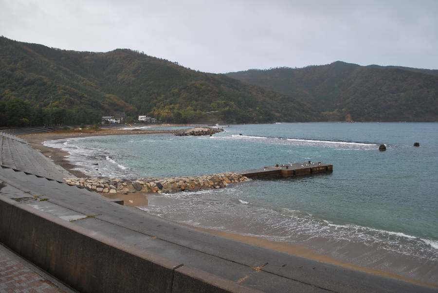 食見海岸は、約1.5mの波があり時々防波堤の根元に波が被ります。