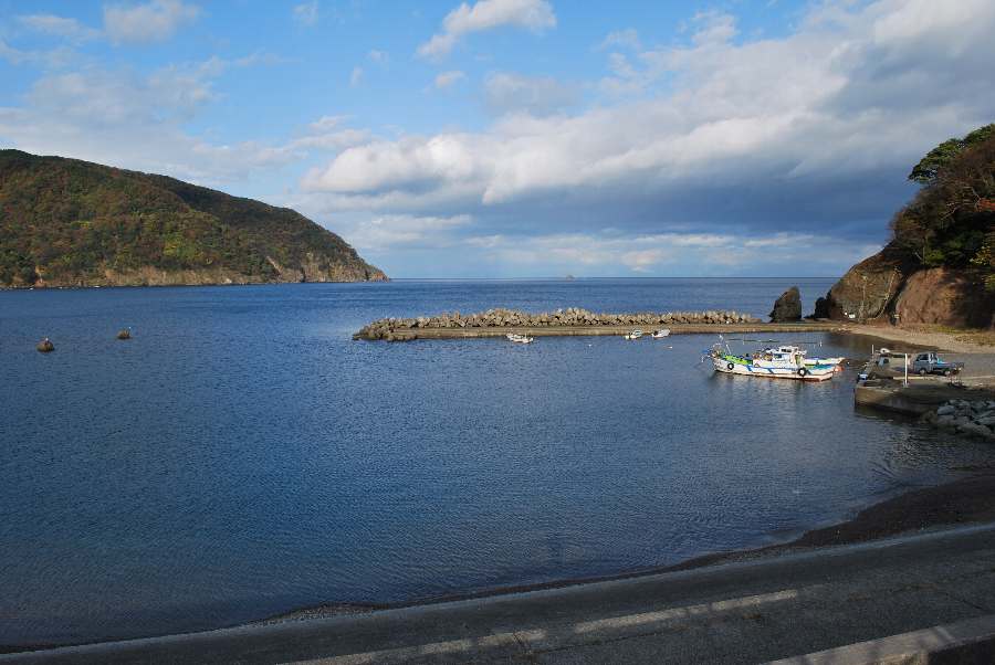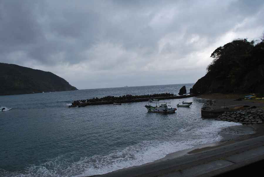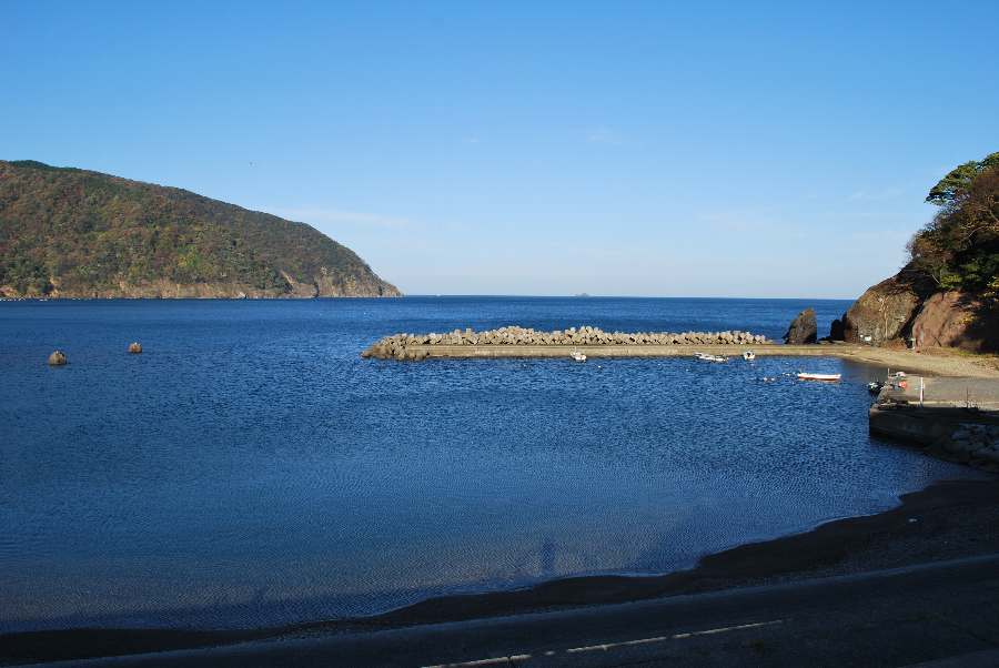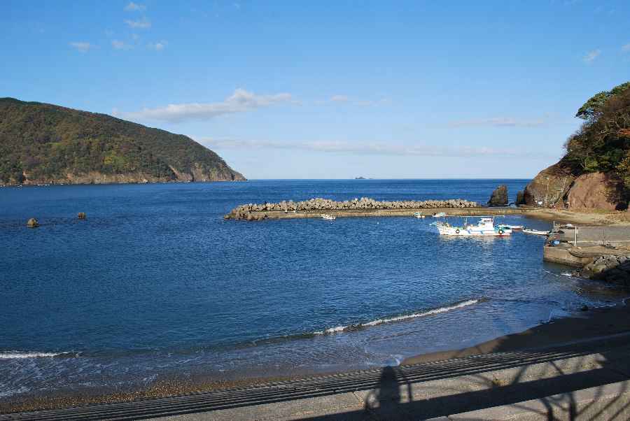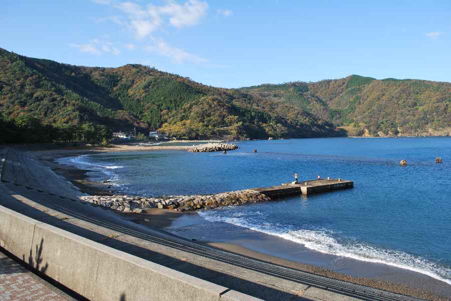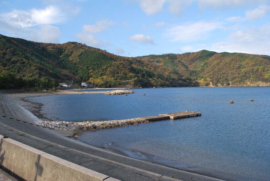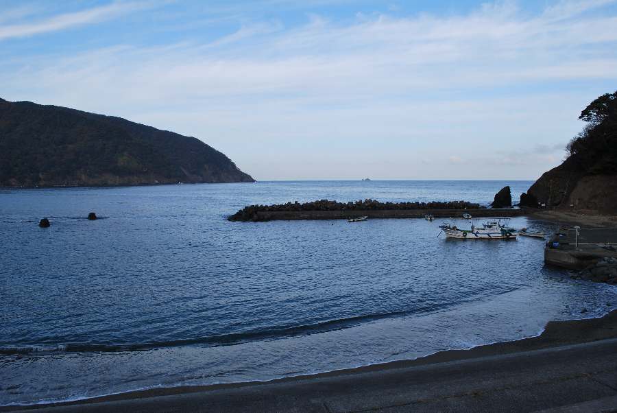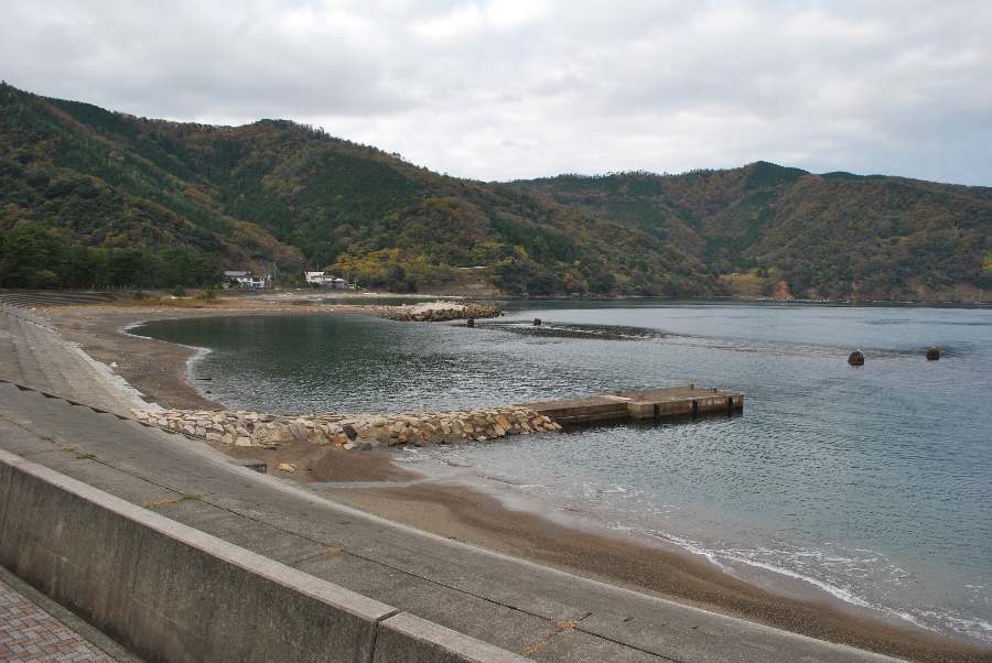 食見海岸は、約1.5mの波があり時々防波堤の根元に波が被ります。