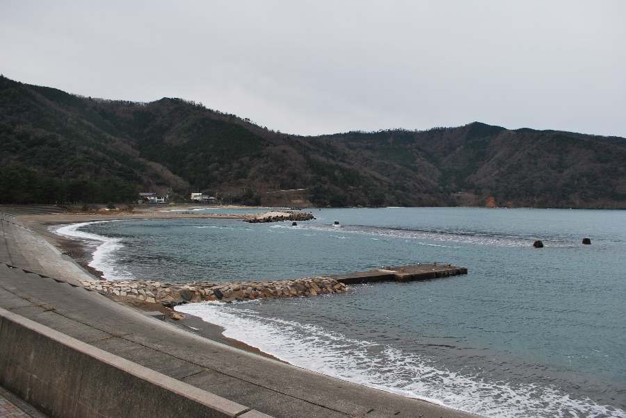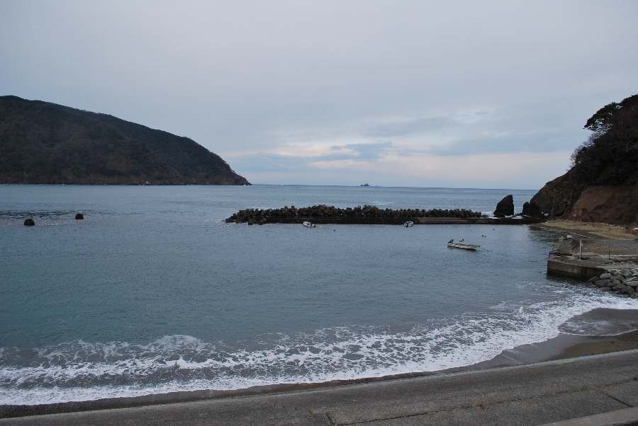食見海岸は、約1.5mの波があり防波堤の根元に波が被ります。
