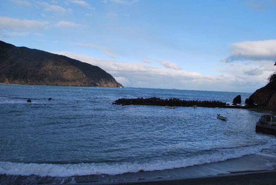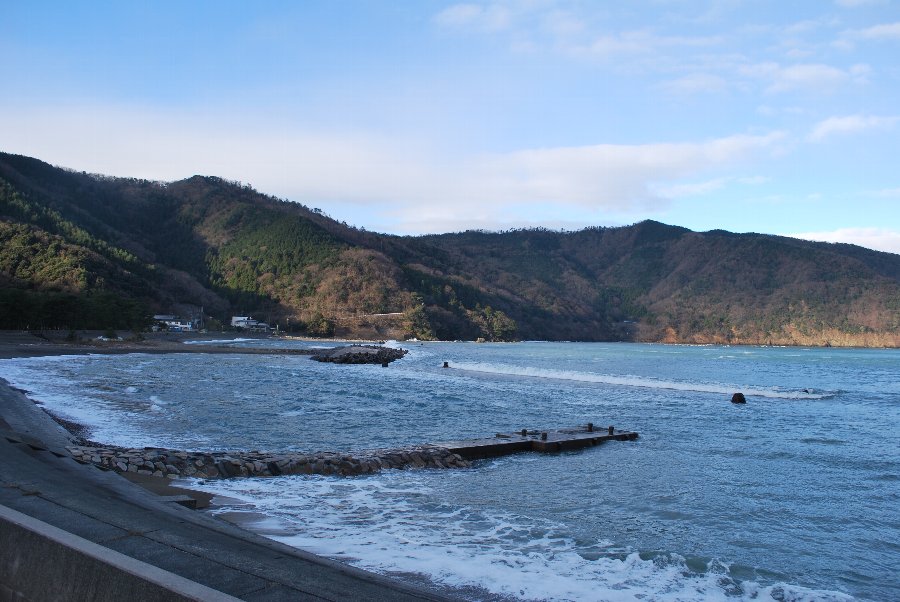 食見海岸は、波が高く、防波堤を超えて波が押し寄せています。