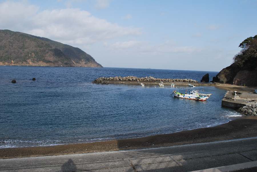 食見海岸は波はほとんどなく、また、大潮の干潮間近で、潜提の頭が露出しています。