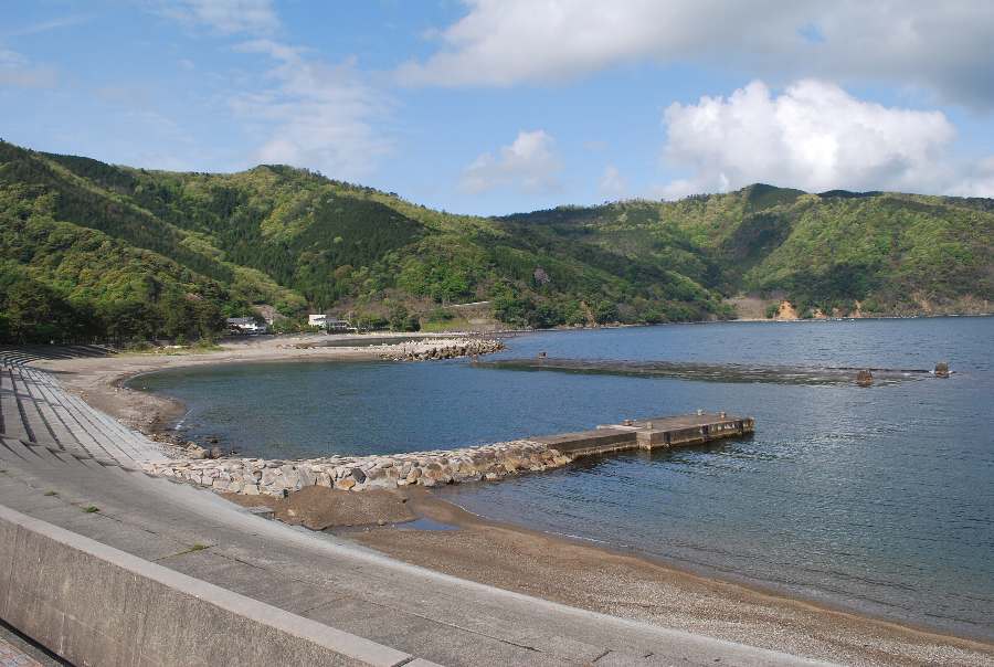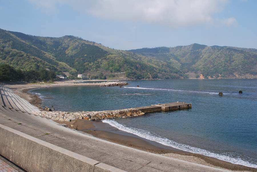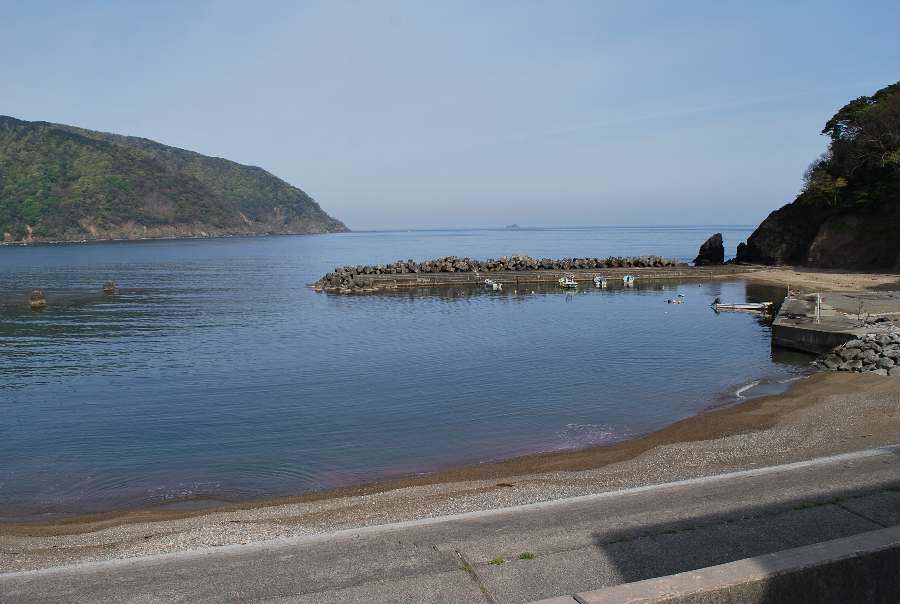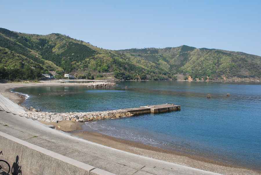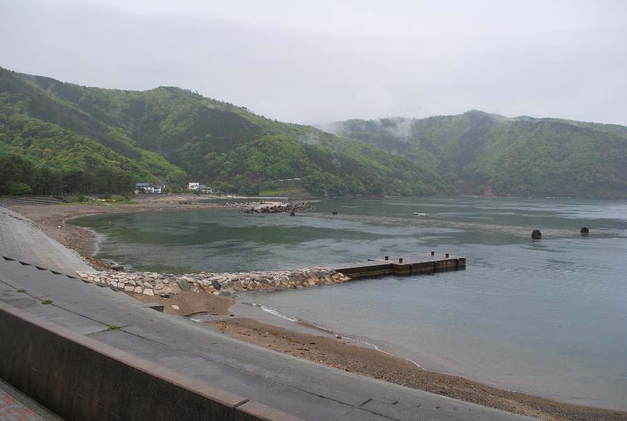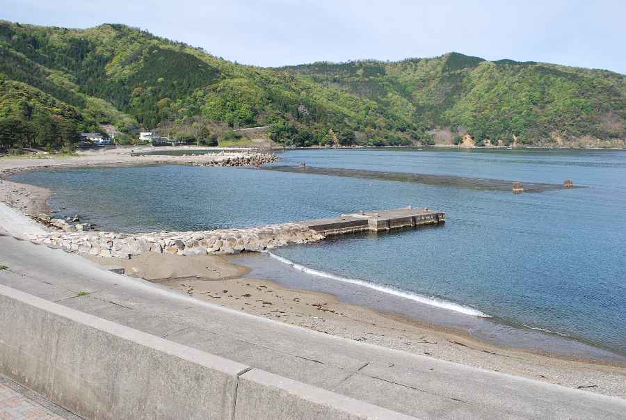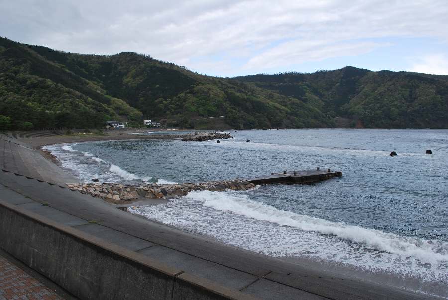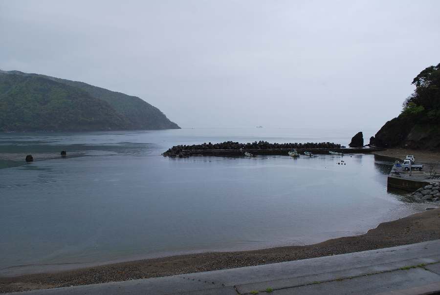 2021年4月28日9時現在は、雨で南東の風があります。 食見海岸は、波も無く穏やかな海況です。 海水の透明度は高く、海底の岩や海藻がよく見えます。