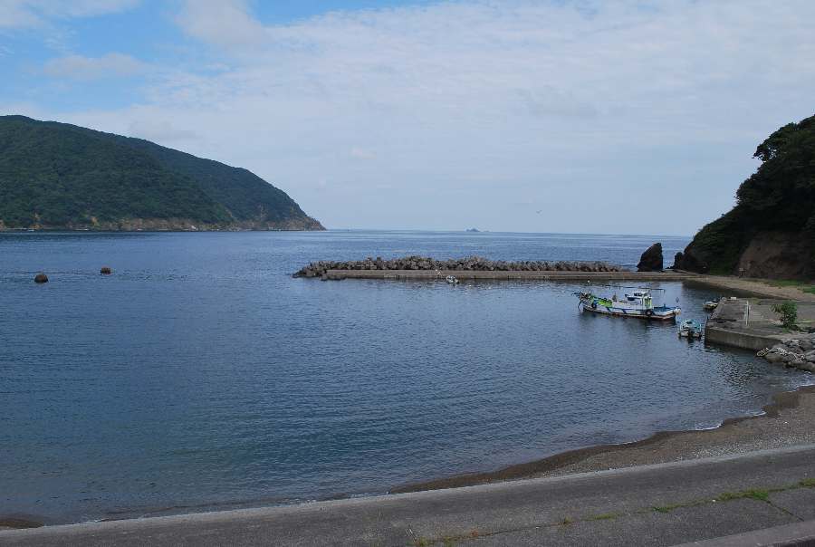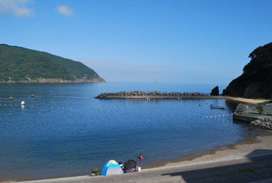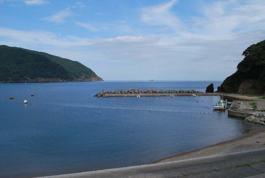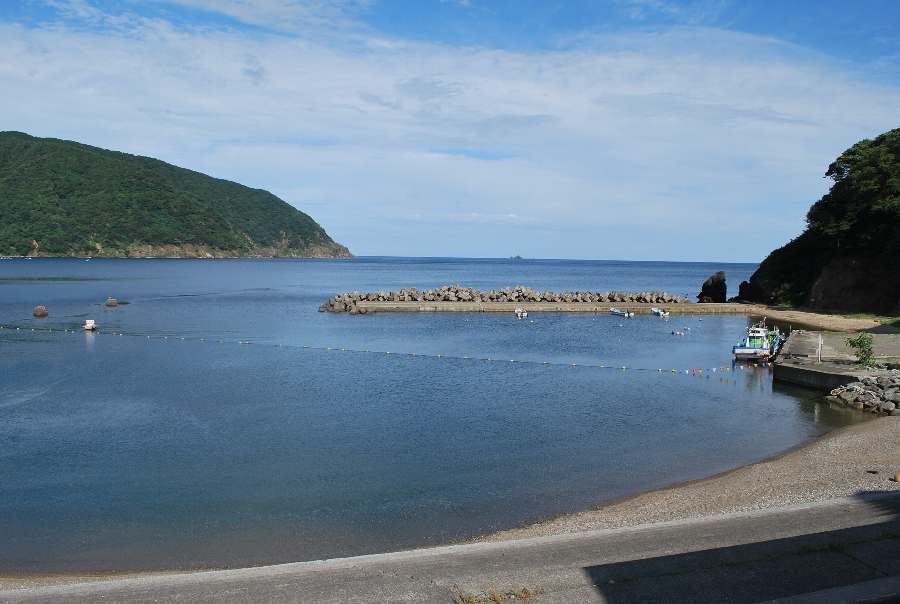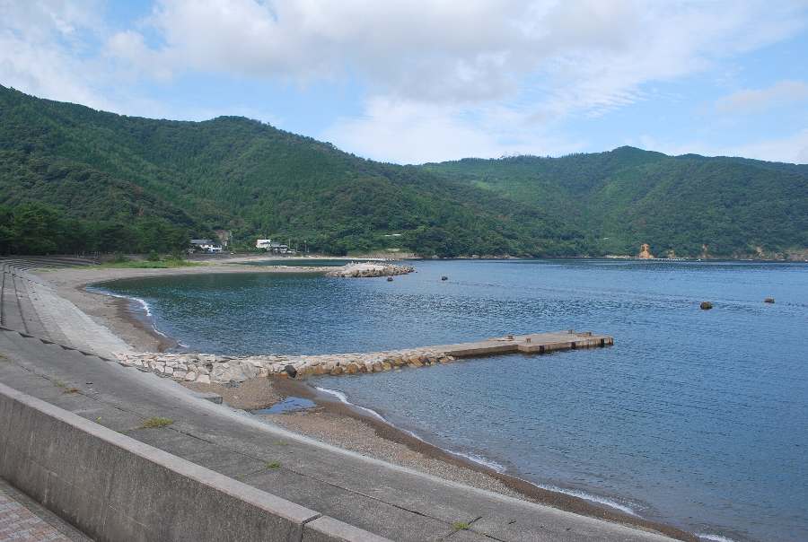 2021年8月27日午前9時現在は、晴れで弱い北の風があります。 食見海岸は、波もなく穏やかな海況です。 海水の透明度は高く、メジナの子の泳ぐ姿や海底の岩が見えます。