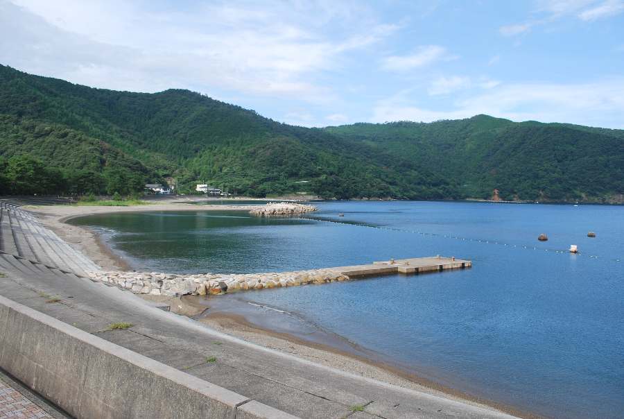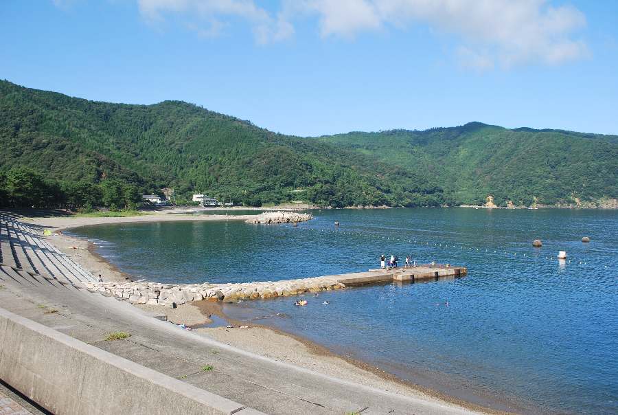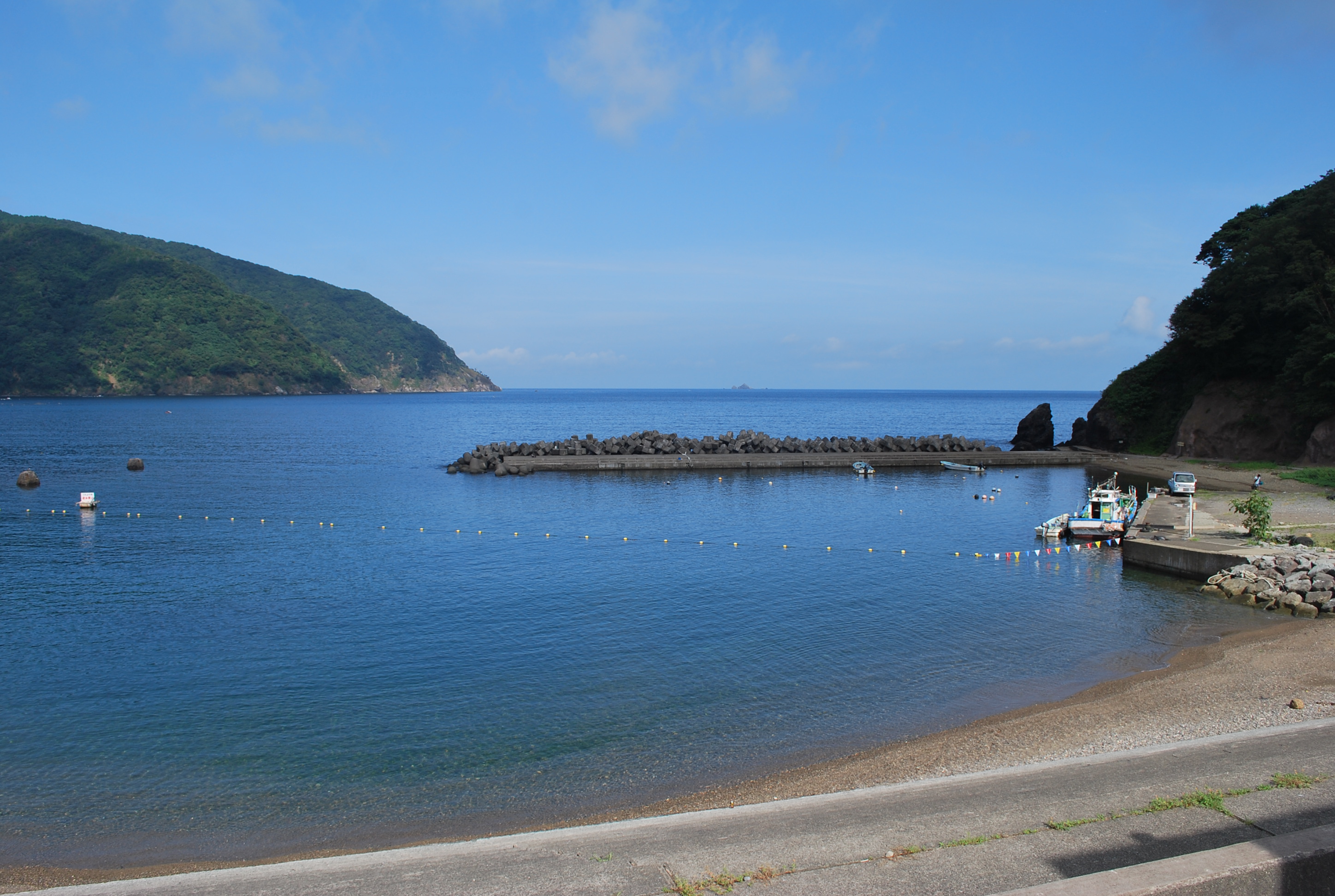 2021年8月28日午前9時現在は、快晴で弱い南寄りの風があります。 食見海岸は、波もなく穏やかな海況です。 海水の透明度は高く、海底の岩までくっきりと見えます。