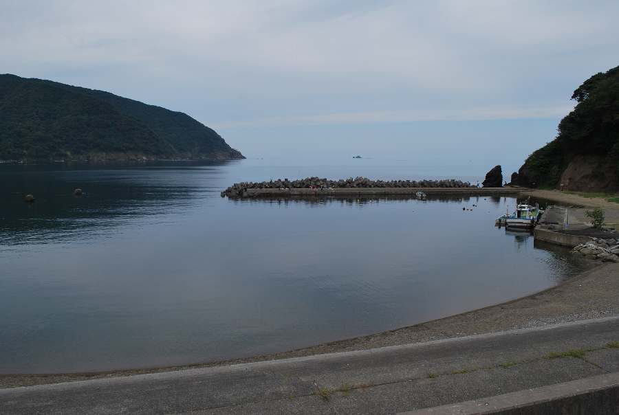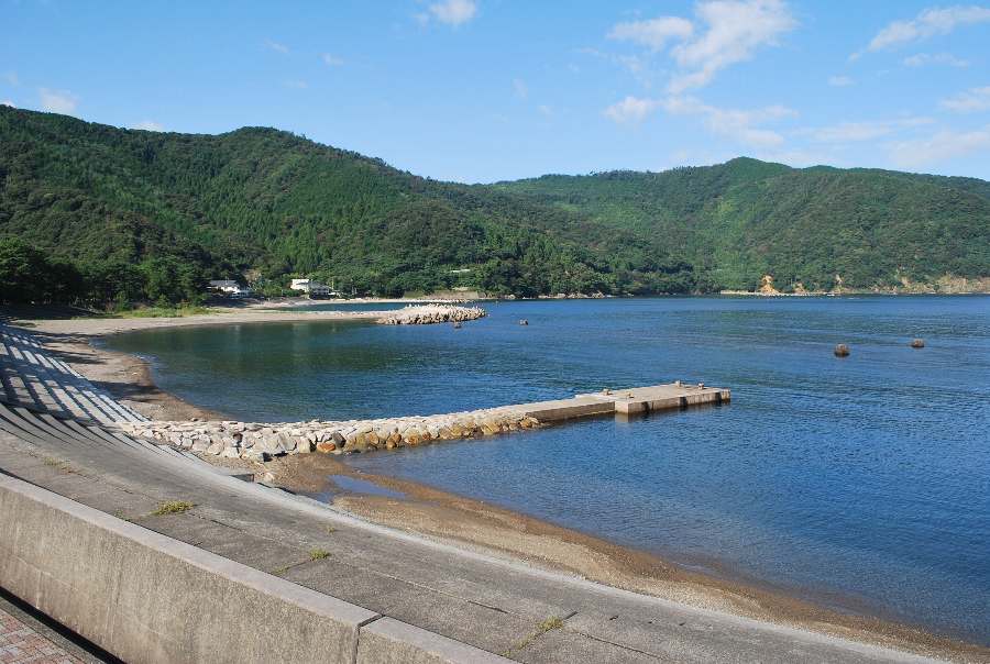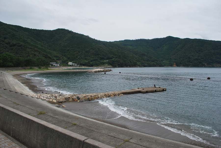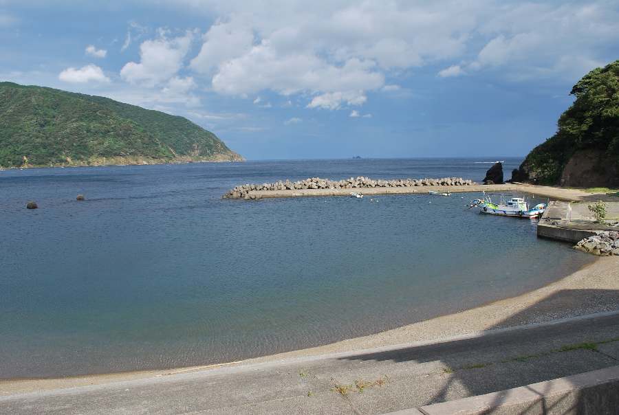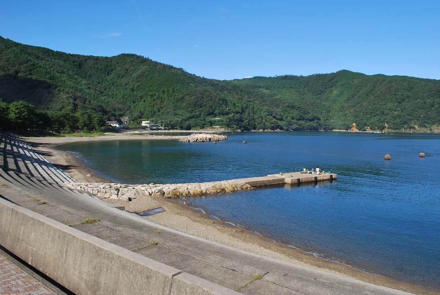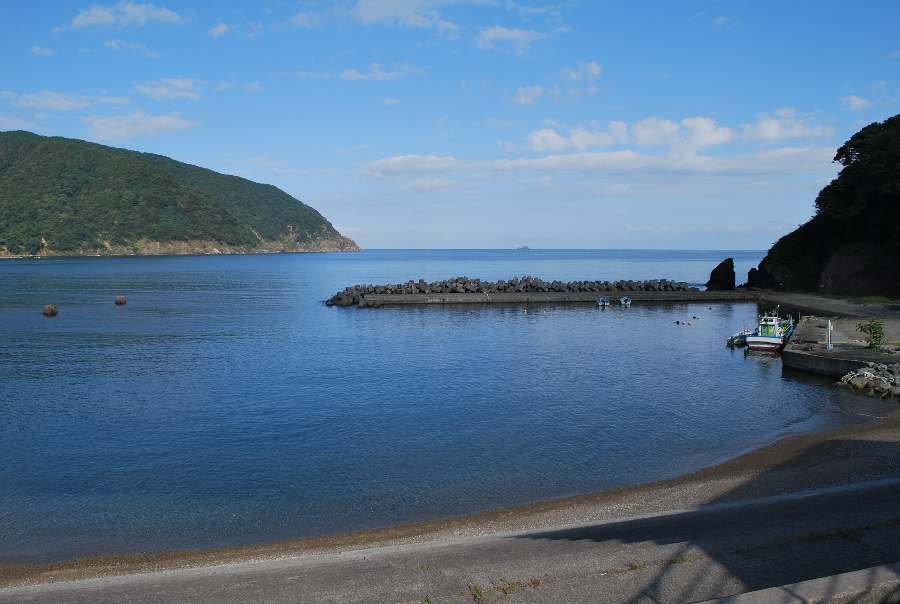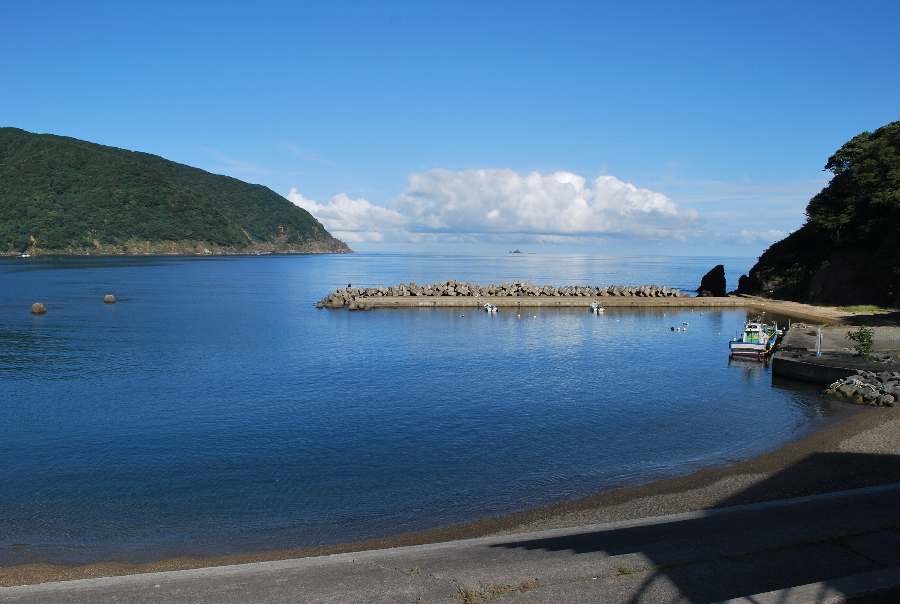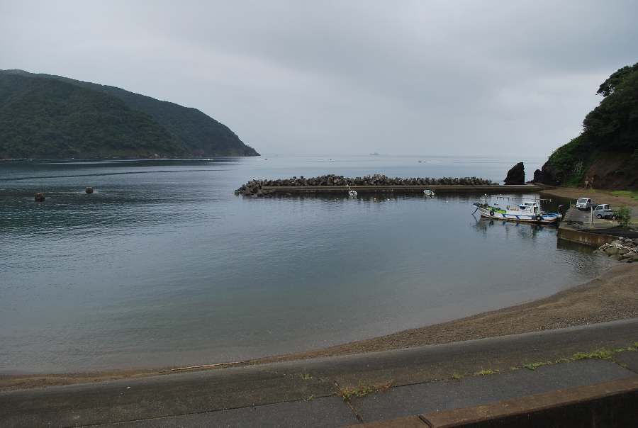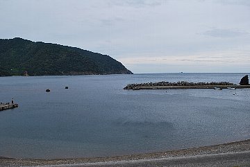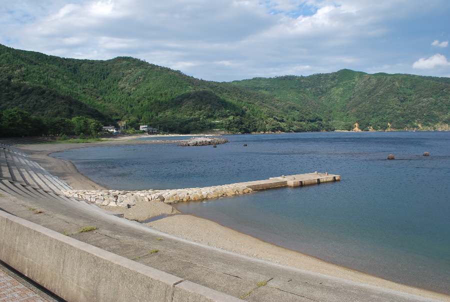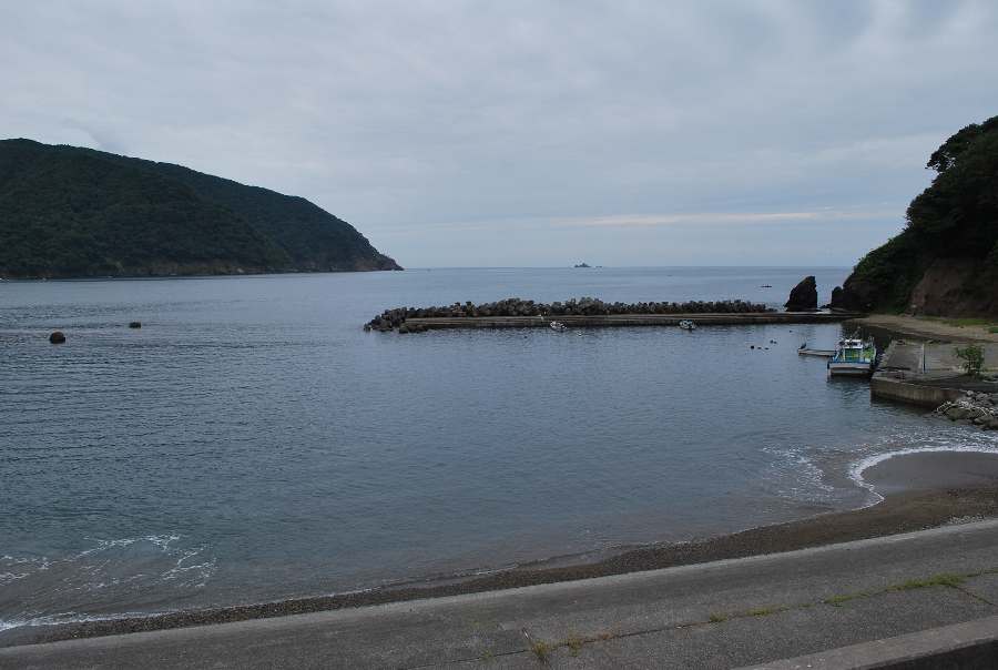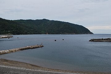 食見海岸は、風によるさざ波があり、沖合いに白波が確認できます。