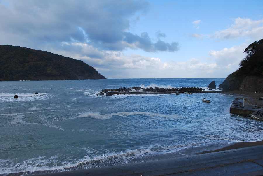 食見海岸は、約3mの波があり、防波堤に大波がかぶっています。