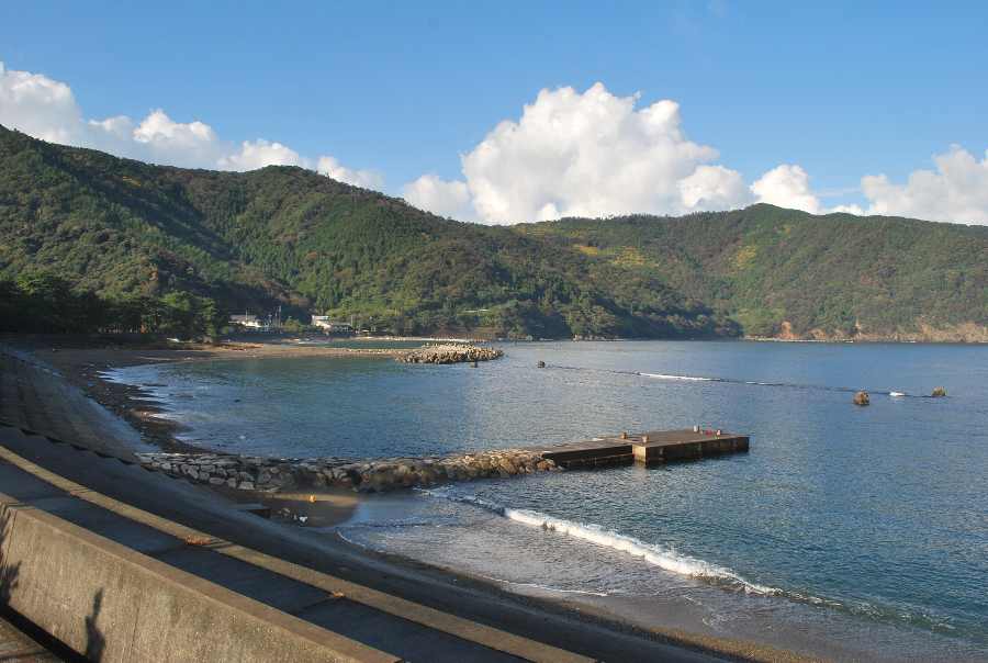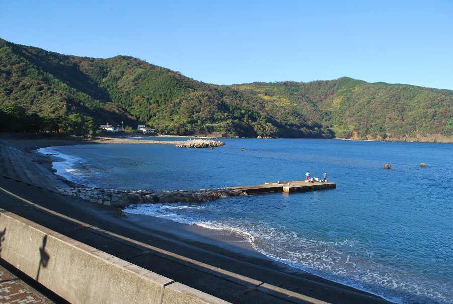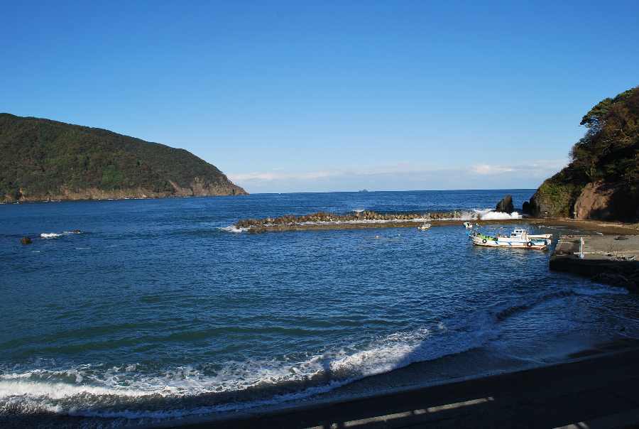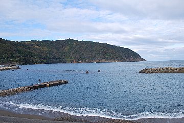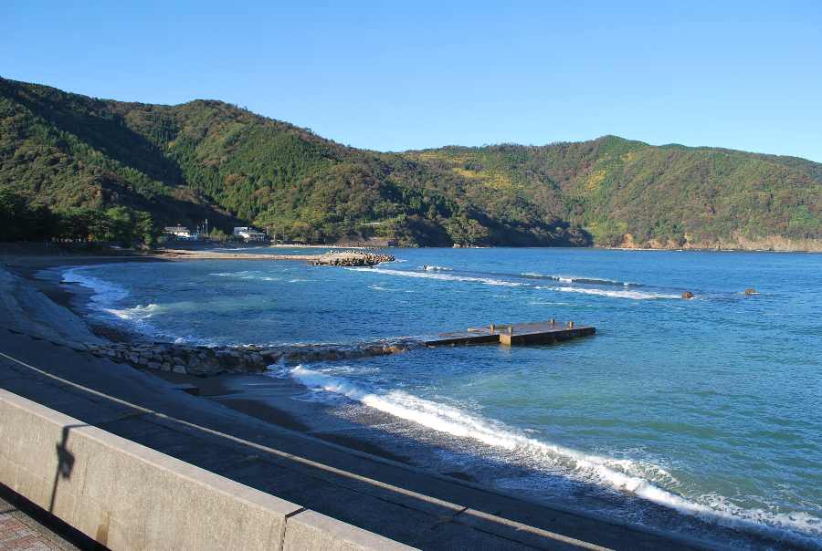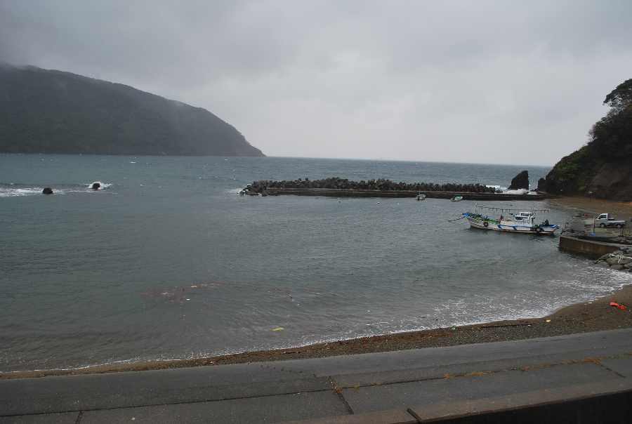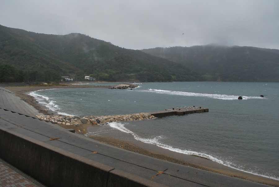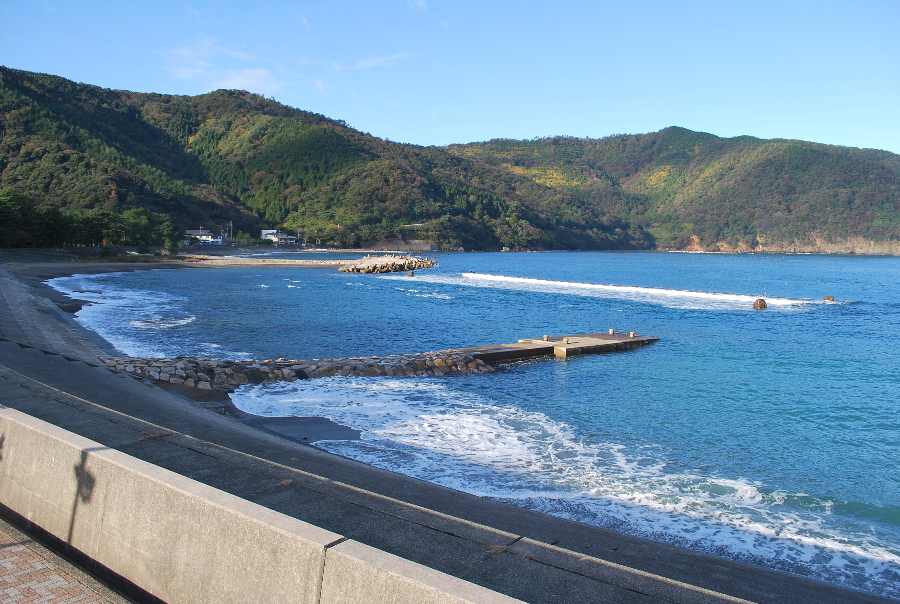 食見海岸は、約2mの波があり、防波堤に波がかぶります。